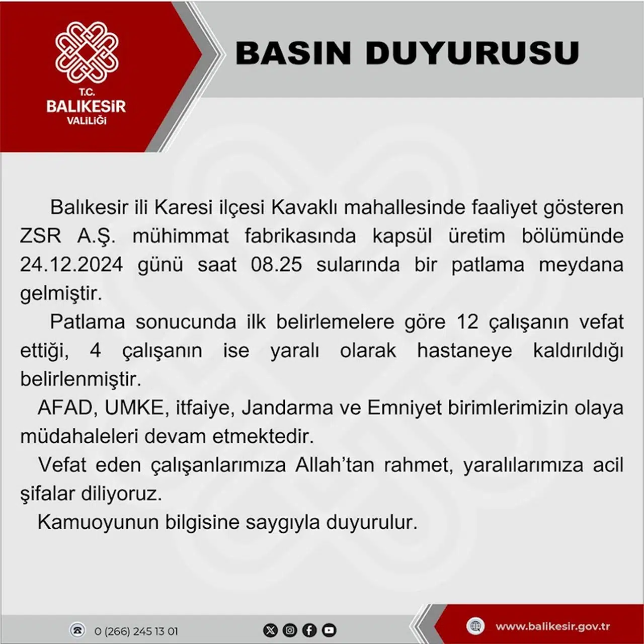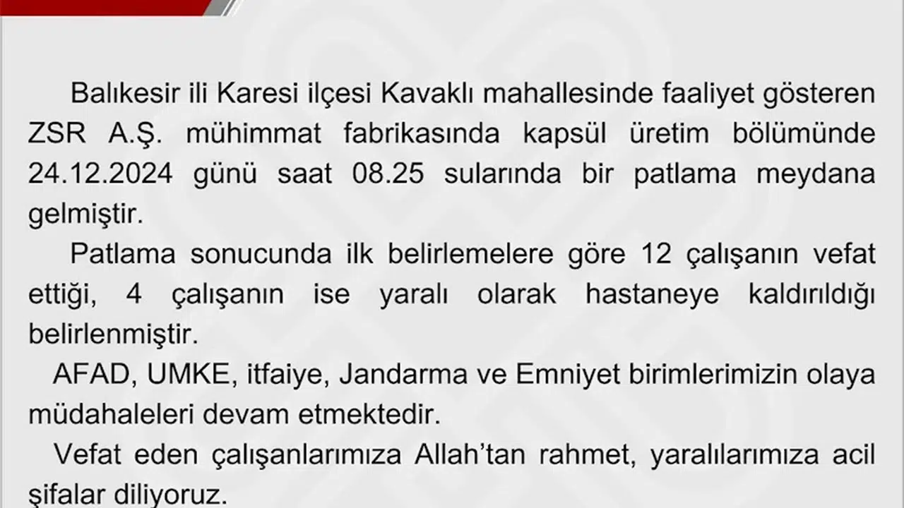 Balıkesir'in Karesi ilçesinde 12 kişinin öldüğü, 4 kişinin yaralandığı patlamayla ilgili Balıkesir Valiliği tarafından yazılı açıklama yapıldı. Açıklamada, "Balıkesir ili Karesi ilçesi Kavaklı Mahallesi'nde faaliyet gösteren ZSR A.Ş. mühimmat fabrikasında kapsül üretim bölümünde 24.12.2024 günü saat 08.25 sularında bir patlama meydana gelmiştir. Patlama sonucunda ilk belirlemelere göre 12 çalışanın vefat ettiği, 4 çalışanın ise yaralı olarak hastaneye kaldırıldığı belirlenmiştir. AFAD, UMKE, itfaiye, jandarma ve emniyet birimlerimizin olaya müdahaleleri devam etmektedir. Vefat eden çalışanlarımıza Allah'tan rahmet, yaralılarımıza acil şifalar diliyoruz. Kamuoyunun bilgisine saygıyla duyurulur" denildi. (DHA)