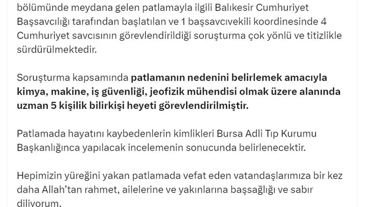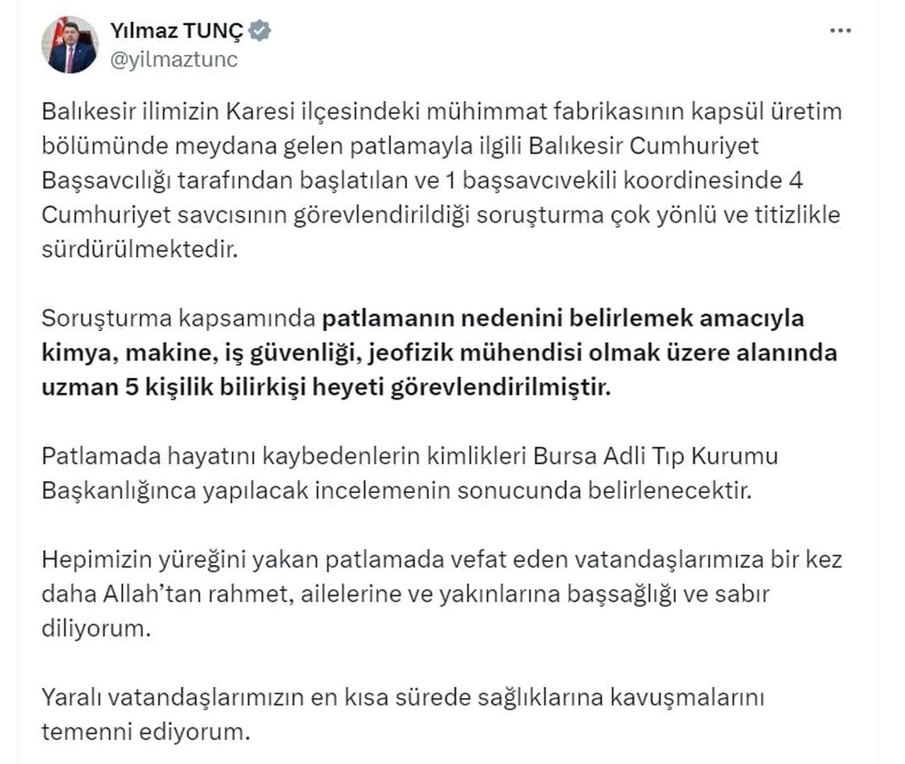 Adalet Bakanı Yılmaz Tunç, sosyal medya hesabından yaptığı açıklamada, Balıkesir'in Karesi ilçesindeki mühimmat fabrikasının kapsül üretim bölümünde meydana gelen patlamayla ilgili Balıkesir Cumhuriyet Başsavcılığı tarafından başlatılan soruşturmanın çok yönlü ve titizlikle sürdürüldüğünü belirterek, "Soruşturma kapsamında patlamanın nedenini belirlemek amacıyla kimya, makine, iş güvenliği, jeofizik mühendisi olmak üzere alanında uzman 5 kişilik bilirkişi heyeti görevlendirilmiştir. Patlamada hayatını kaybedenlerin kimlikleri Bursa Adli Tıp Kurumu Başkanlığınca yapılacak incelemenin sonucunda belirlenecektir. Hepimizin yüreğini yakan patlamada vefat eden vatandaşlarımıza bir kez daha Allah’tan rahmet, ailelerine ve yakınlarına başsağlığı ve sabır diliyorum. Yaralı vatandaşlarımızın en kısa sürede sağlıklarına kavuşmalarını temenni ediyorum" dedi. (DHA)