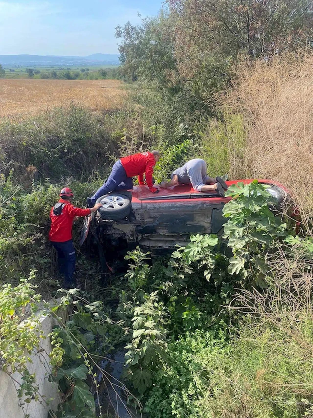 Balıkesir'de sürücüsünün direksiyon hakimiyetini kaybettiği otomobil, dere yatağına devrildi