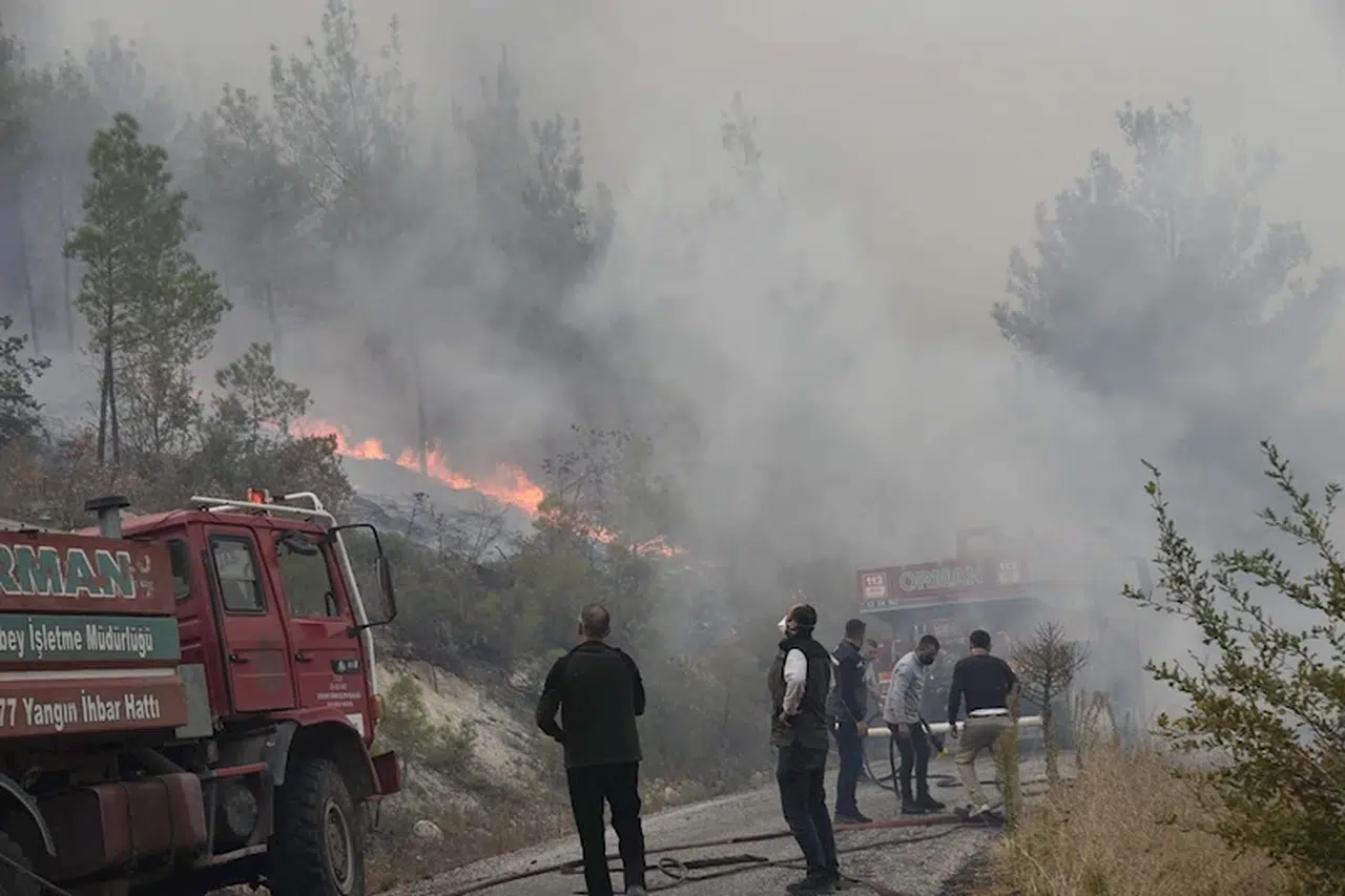 Bursa'nın Büyükorhan ilçesinde dün saat 14.00 sıralarında çıkan orman yangını, Balıkesir'in Dursunbey ilçesinin kırsal Adaören Mahallesi yakınlarına sıçradı. Dursunbey’de alevler yerleşim yerine 1 kilometre kadar yaklaştı. Yangına 2 helikopter, 19 arazöz, 7 su ikmal aracı, 5 ilk müdahale aracı, 8 hizmet aracı, 3 dozer, 4 greyder, 3 treyler ve 150 personel ile müdahale etti. Diğer kurumlardan gelen 6 iş makinası, 10 araç ve 60 personel de söndürme çalışmalarına destek verdi. Bursa ve Balıkesir illerinde süren yangına helikopterle müdahale, havanın kararmasıyla sonlandırıldı. Balıkesir, Bursa, Yalova ve Kütahya orman bölge müdürlüklerinin arazözleri ile itfaiye ekiplerinin müdahalesi ise gece boyunca sürdü.