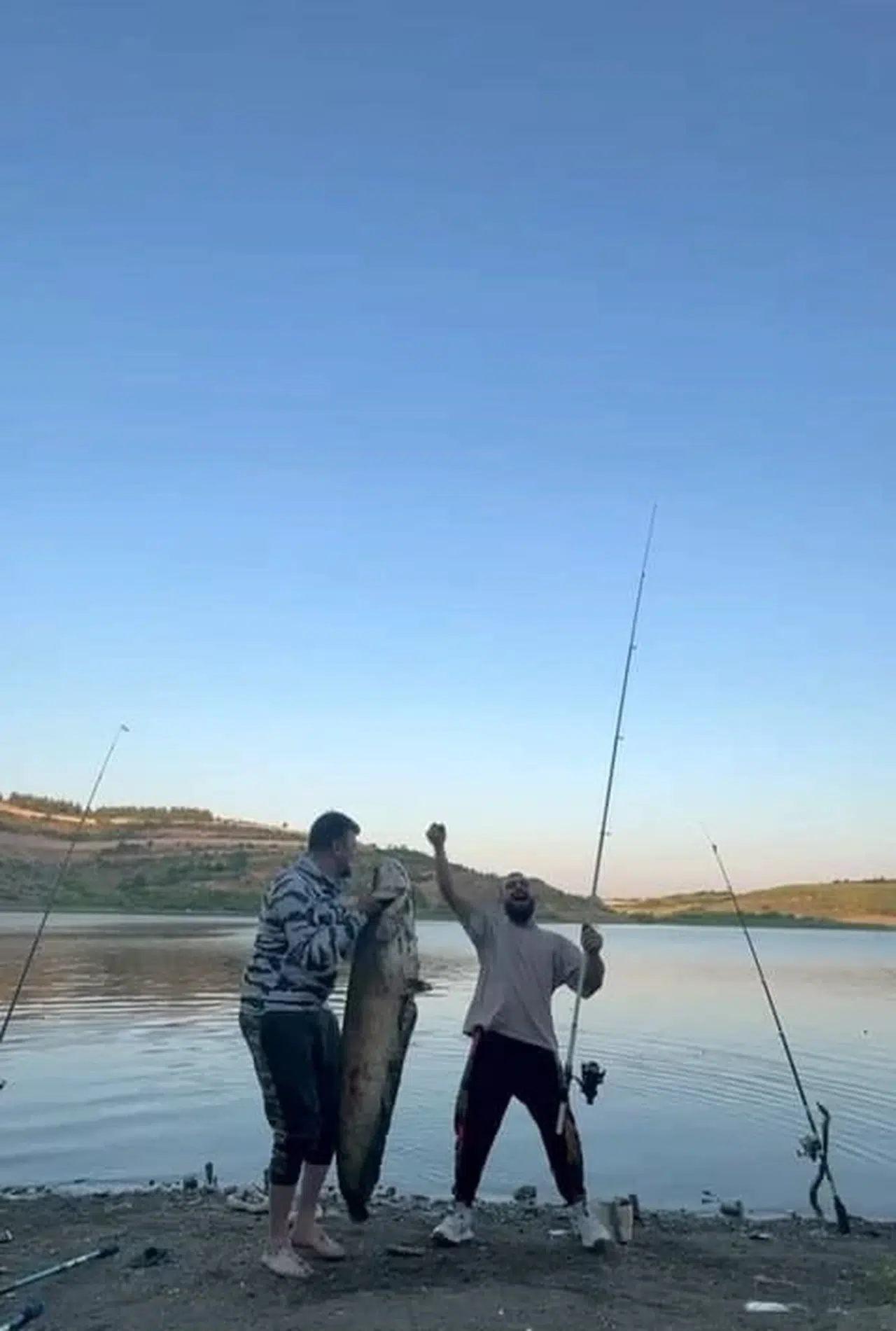 İnegöl ilçesi Boğazköy Baraj Gölü'ne balık tutmaya giden İsmail Polat ile Ahmet Kaan Bahadır, oltalarına takılan balığın ağırlığı karşısında önce panik oldu. Balığı kaçırmamak için uğraş veren 2 arkadaş, ardından kıyıya çıkardıkları balığın büyüklüğü karşısında mutluluk yaşadı. Balık tutkunu 2 arkadaşın o anları cep telefonu kamerasına yansırken, tuttukları yayın balığının 24 kilo ağırlığında, 165 santimetre uzunluğunda olduğu öğrenildi. (DHA)
