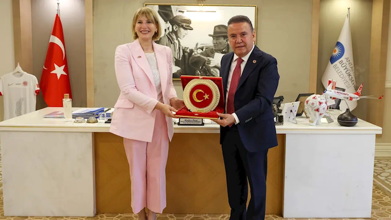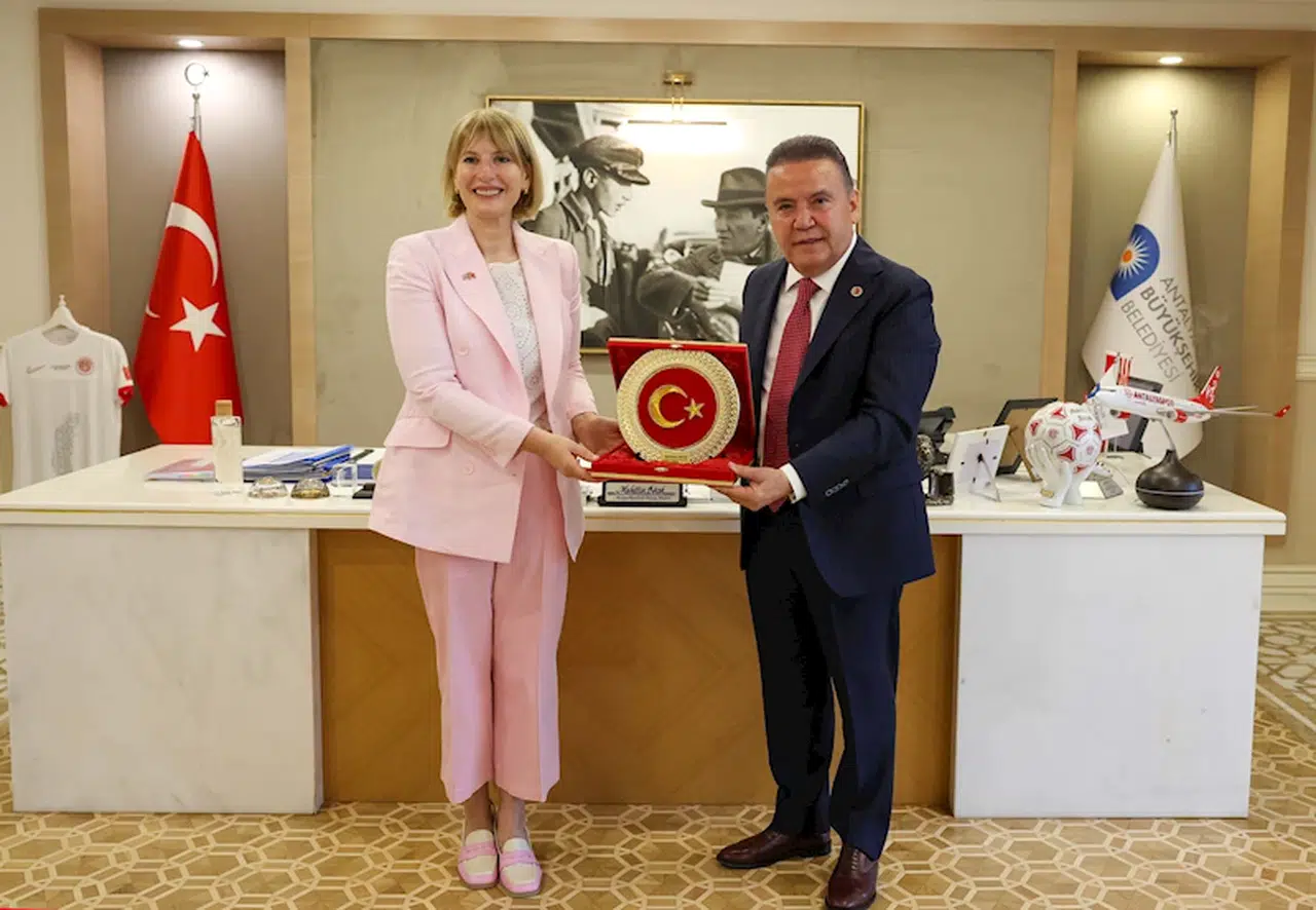 ANTALYA, (DHA)- BİRLEŞİK Krallık Türkiye Büyükelçisi Jill Morris ve beraberindeki heyet, Antalya Büyükşehir Belediye Başkanı Muhittin Böcek’i ziyaret etti. Ziyarette ağırlıklı olarak tarım ve turizm konuları ele alındı. Büyükelçi Morris, sürdürülebilirlik ve çevre konusunun İngiltere’nin de önem verdiği konuların başında geldiğini belirterek, Antalya Büyükşehir Belediyesi’nin yaptığı çalışmaların turizmi canlandıracak ve turist sayısını arttıracak önemli faktörler olduğunu söyledi.