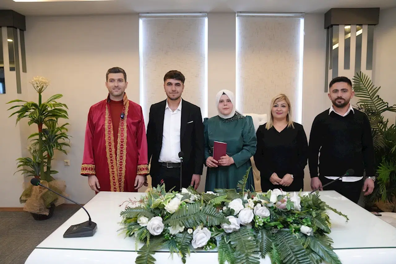 Evlilik tarihlerini 14 Şubat Sevgililer Günü’ne denk getiren çiftler, Erbaa Belediyesi Nikah Salonu’na geldi. Dünya evine girmek için bu özel günü tercih eden Zeynep Aslan ve Dursun Kurtgöz çiftinin nikahını saat tam 14.14’te Erbaa Belediye Başkanı Ertuğrul Karagöl kıydı. Daha sonra ise Fadime Gülmez ve Hami Tütüncü’nün nikahını kıyan Başkan Karagöl büyük heyecan yaşayan çiftlere ömür boyu mutluluklar dileyip, aile cüzdanlarını gelinlere teslim etti.