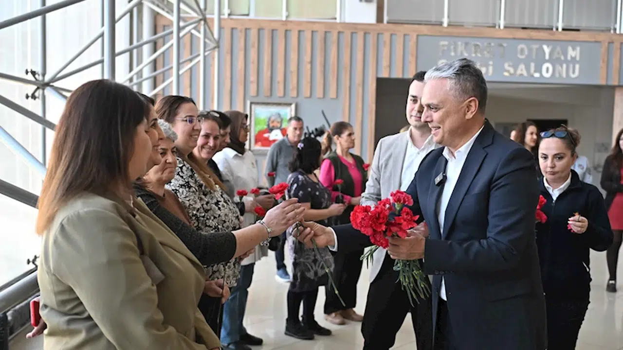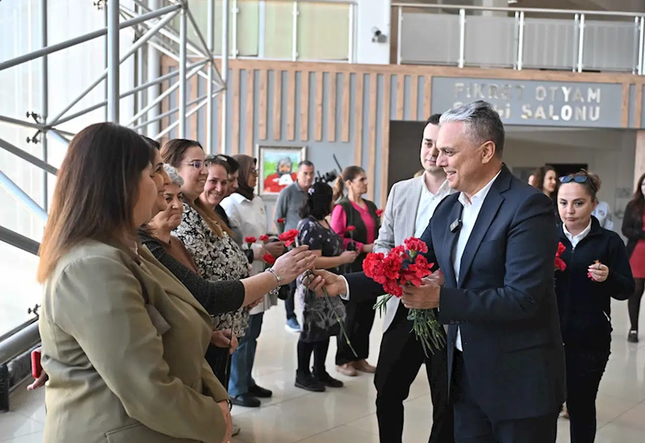 Başkan Uysal, konuşmasının ardından belediyedeki kadın çalışanlara çiçek dağıtarak 8 Mart Dünya Kadınlar Günü’nü kutladı. (DHA)
