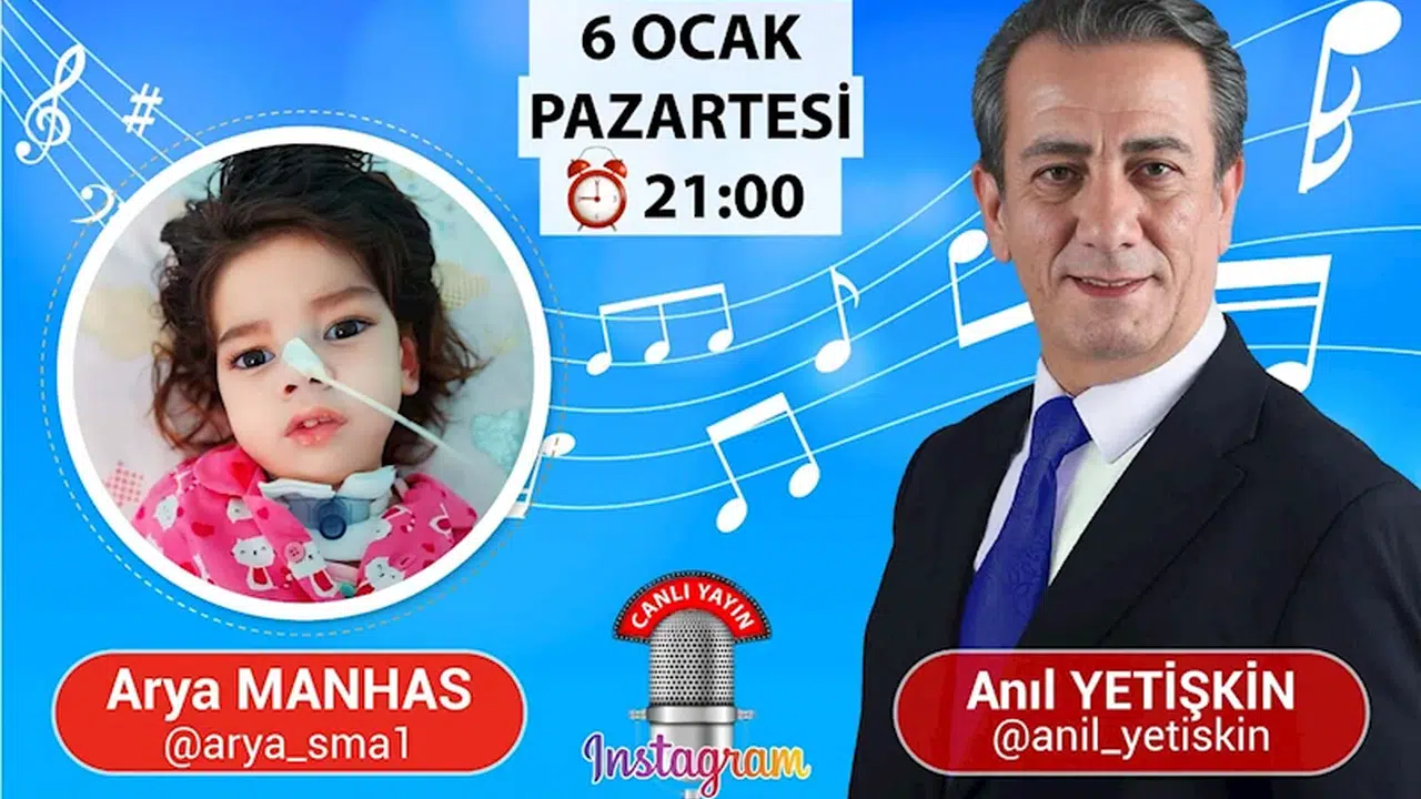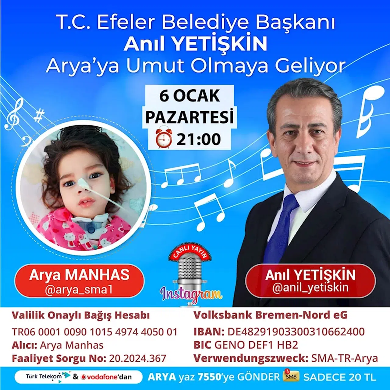 AYDIN, (DHA-AYDIN'ın Efeler Belediye Başkanı Anıl Yetişkin, SMA hastası Arya Manhas için düzenlenen yardım kampanyasına destek vermek amacıyla bugün Arya'nın sosyal medya hesabı üzerinden açılacak canlı yayına katılıp, bağış çağrısında bulunacak.