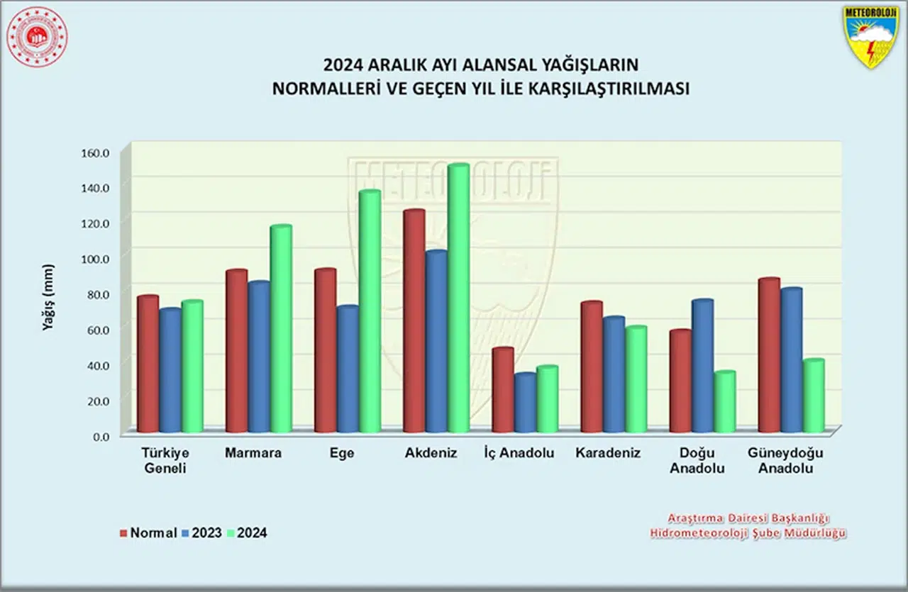 Aralık ayında yağışlar; Trakya'nın kuzeyi, Ege Bölgesi'nin batı kesimleri, Antalya, Burdur ve Mersin çevreleri ile Giresun'un doğu kesimlerinde normallerine göre yüzde 40'ın üzerinde arttı. Çorum, Amasya, Samsun, Malatya, Şanlıurfa, Mardin, Siirt, Şırnak, Hakkari, Van ve Ağrı çevrelerinde yüzde 60'ın üzerinde azaldı. Bölge genelinde Marmara, Ege, Akdeniz bölgeleri normalleri üzerinde yağış aldı. Diğer bölgeler normalleri altında yağış aldı.