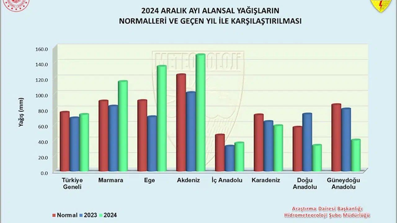 Mehmet ÇINAR/ANTALYA, (DHA)-METEOROLOJİ Genel Müdürlüğü'nün 2024 yılı Aralık ayı sıcaklık ve yağış raporlarına göre; Türkiye genelinde ortalama sıcaklıklar normaline göre 1,3 derece yükseldi. Yağış raporuna göre; Güneydoğu'da yağışlar yüzde 53 azalırken, Antalya ve Burdur'da son 15 yılın, Isparta ve Muğla'da son 12 yılın, Ege'de ise son 10 yılın en yüksek aralık ayı yağışları kaydedildi.