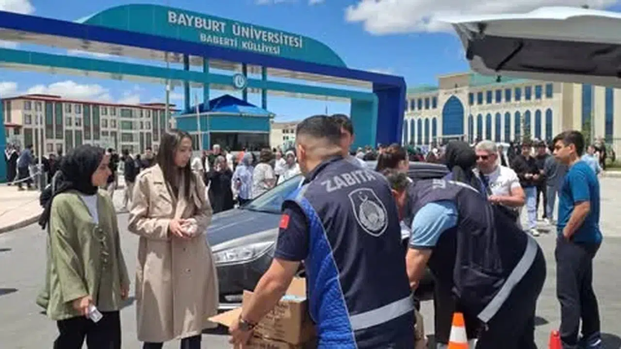 Bayburt Belediyesi Zabıta Müdürlüğü, Yükseköğretim Kurumları Sınavı'nın (YKS) ikinci oturumunda da sınav merkezleri önünde görev başındaydı. Öğrencilere ve onları bekleyen ailelerine su ikramında bulunarak sınav stresini bir nebze olsun hafifletmeyi amaçladı.