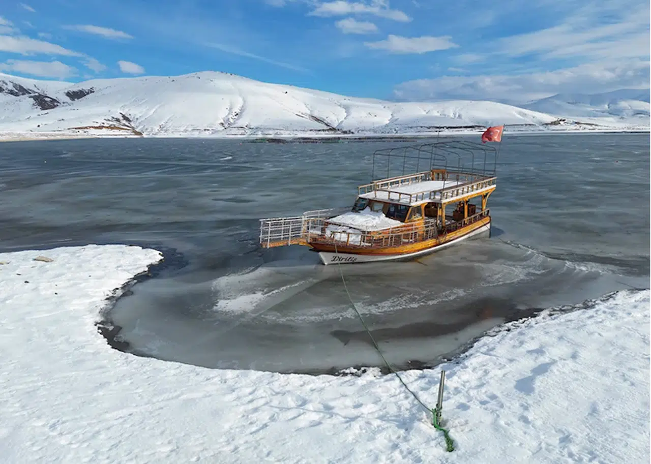Yüzeyi kısmen buz tutan baraj ve beyaza bürünen çevresi, dronla görüntülendi.
