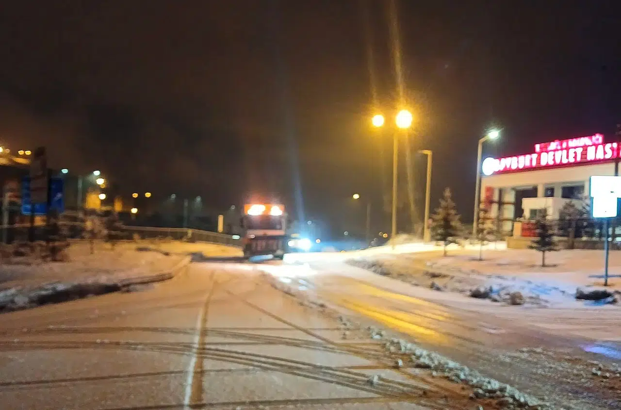 Bayburt’ta sabaha karşı etkili olan kar yağışının ardından belediye ekipleri kent genelinde çalışma başlattı. Olası olumsuzlukların önüne geçmek amacıyla harekete geçen ekiplerin, gece saatlerinden itibaren sahada görev yaptığı bildirildi.