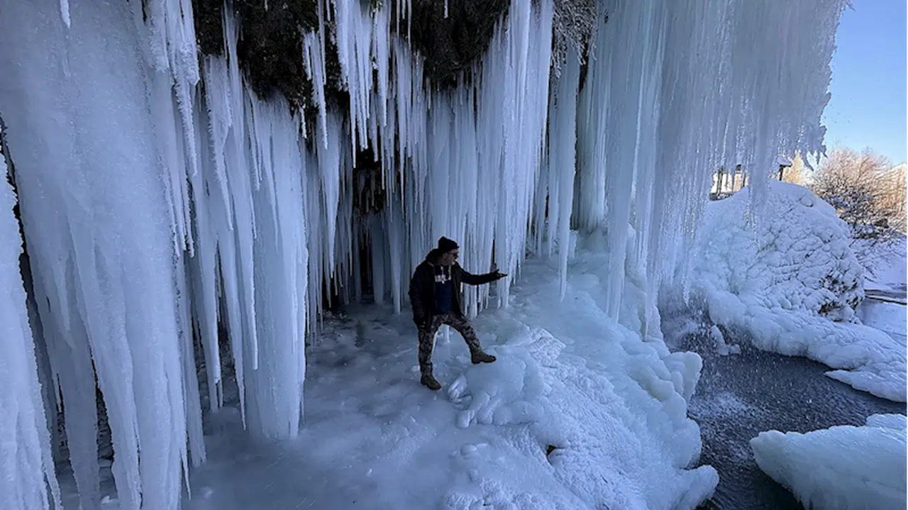 Soğuk havanın etkisiyle şelalenin bazı kısımlarının tamamen buzla kaplandığını belirten Faruk, devasa buz kütlerinin görsel açıdan muhteşem olduğunu kaydetti.