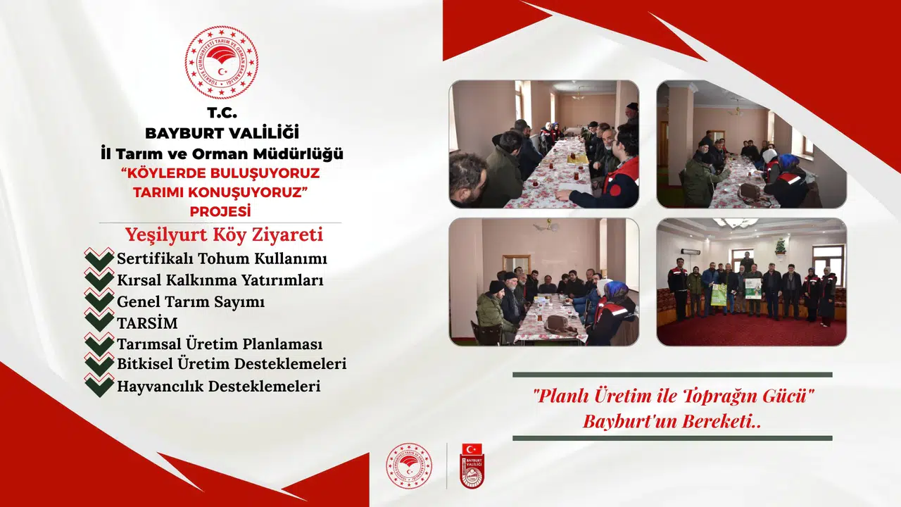 “Köylerde Buluşuyoruz, Tarımı Konuşuyoruz” projesi kapsamında Bayburt İl Tarım ve Orman Müdürlüğü teknik personeli, Yeşilyurt köyünde üreticilerle bir araya geldi. Gerçekleştirilen ziyaretlerde tarımsal üretimin geliştirilmesi, verimliliğin artırılması ve sürdürülebilirliğin sağlanması amacıyla kapsamlı bilgilendirmeler yapıldı.