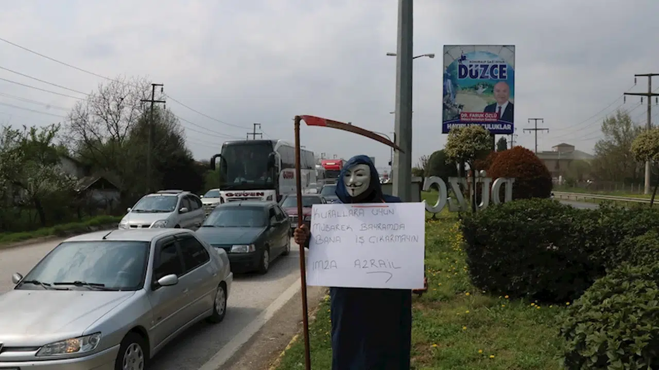 Ramazan Bayramı'nın sona ermesi ile birlikte özel sektör çalışanlarının dün itibarıyla İstanbul'a dönüş yolculuğu başladı. Dönüşler bugün de sürerken, tatilciler Anadolu Otoyolu ve D-100 kara yolunun Düzce geçişinde trafik yoğunluğu oluşturdu. Bayram tatillerinde trafik kazalarındaki ölümlere dikkat çekmek isteyen amatör tiyatrocu Resul Gür de D-100 kara yolunda V For Vendetta karakterinin maskesini takıp, eline de tırpan alarak farkındalık oluşturmaya çalıştı. Gür, dönüş yolundaki sürücüleri 'Kurallara uyun, mübarek bayramda bana iş çıkarmayın' yazılı pankartla uyardı.
