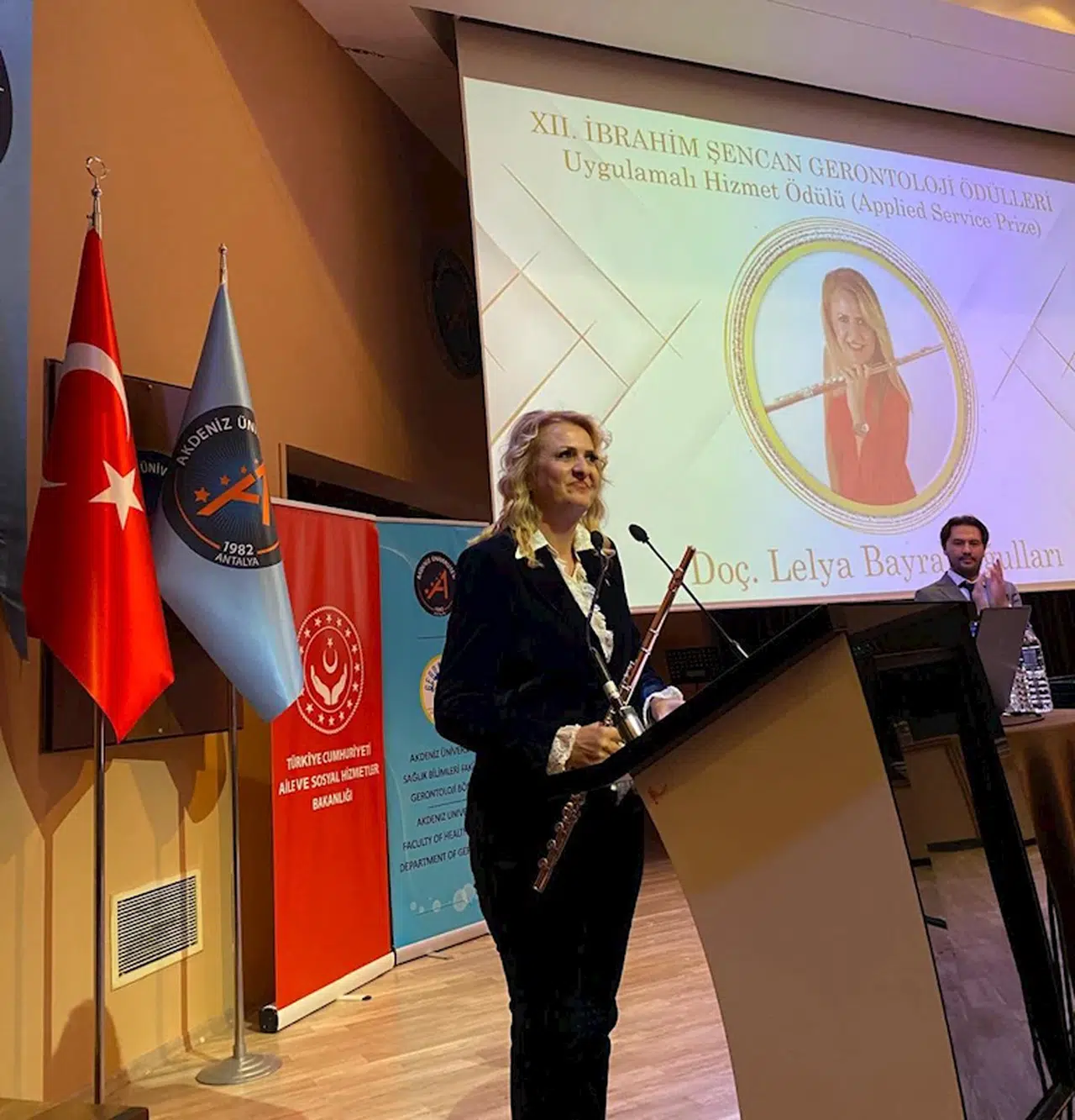 60+Tazelenme Üniversitesi'nde gönüllü flüt eğitmenliği yapan Doç. Lelya Bayramoğulları, AÜ Atatürk Konferans Salonu'nda gerçekleşen 11. Uluslararası Sosyal ve Uygulamalı Gerontoloji Sempozyumu'nda düzenlenen 12. İbrahim Şencan Ödülleri kapsamında ödüle layık görüldü. Dünyanın farklı ülkelerinden pek çok bilim insanına ödülleri Şencan ailesi tarafından takdim edildi.