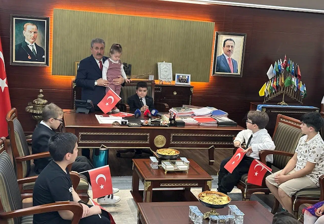 BBP lideri Mustafa Destici, 23 Nisan Ulusal Egemenlik ve Çocuk Bayramı dolayısıyla makamında çocuklarla bir araya geldi. Makamını çocuklara bırakan Destici, hatıra fotoğrafı çektirdi; daha sonra hazırladıkları hediyeleri takdim etti. Burada açıklamalarda bulunan Destici, “Bizim geleceğimiz siz sevgili çocuklarımızsınız. Biz her zaman şunu dile getiriyoruz; ‘bir çocuğun güldüğü her yer vatandır’ diyoruz. Bir çocuğun hayali her şeyin başlangıcıdır. Sizin varlığınız bizi umutlandırmakta, ümitlendirmektedir. Türkiye Cumhuriyeti Devleti’ni daha da ileriye taşıyacak ve dünya var oldukça yeryüzünde güçlü bir devlet olarak bulunmasını sağlayacak ve devam ettirecek olan da siz kıymetli çocuklarsınız. Siz çocuklarımız olarak ailelerinizin sevgililerisiniz. Bunun yanı sıra siz vatanımızın en önemli nadide çiçeklerisiniz ve bizim geleceğimizsiniz, istikbalimizsiniz. Bir toplum ne kadar çok çocuğa sahip ise, o kadar ileride daha büyük bir devlet, toplum ve daha büyük bir millet olur. Bizler Türkiye Cumhuriyeti Devletimizin varlığını, ülkemizin bütünlüğünü, milletimizin istiklalini ve istikbalini muhafaza etmek için çalışıyoruz. Çocuklarımıza, gençlerimize çok önem ve kıymet veriyoruz. Sizleri bugün burada görmekten büyük mutluluk duyduğumu bir kez daha ifade etmek istiyorum. Büyük Birlik Partimize hoş geldiniz, şeref verdiniz” dedi.