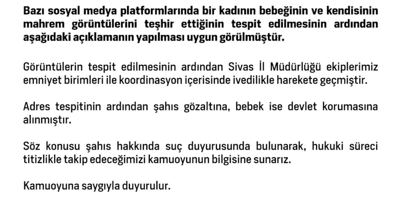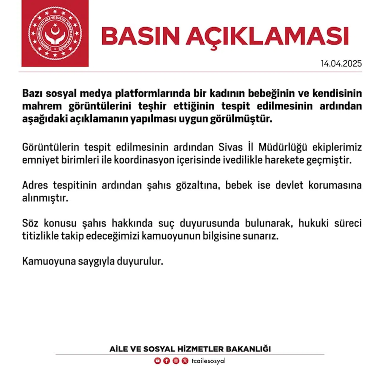 Bakanlıktan yapılan yazılı açıklamada, bazı sosyal medya platformlarında bir kadının bebeğinin ve kendisinin mahrem görüntülerini teşhir ettiğinin tespit edildiği belirtilerek, "Görüntülerin tespit edilmesinin ardından Sivas İl Müdürlüğü ekiplerimiz emniyet birimleri ile koordinasyon içerisinde ivedilikle harekete geçmiştir. Adres tespitinin ardından şahıs gözaltına, bebek ise devlet korumasına alınmıştır. Söz konusu şahıs hakkında suç duyurusunda bulunarak, hukuki süreci titizlikle takip edeceğimizi kamuoyunun bilgisine sunarız" denildi. (DHA)