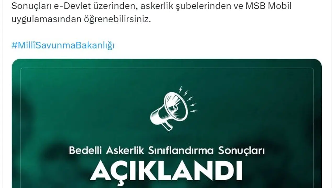 Bakanlığın sosyal medya hesabından yapılan açıklamada, "Bedelli askerlik hizmeti kapsamında 2025 yılında silahaltına alınacak yükümlülerin celp dönemleri ile birlik yerleri sınıflandırma kurulu huzurunda dışarından müdahaleye kapalı yazılım vasıtası ile belirlenmiştir. Sonuçları e-Devlet üzerinden, askerlik şubelerinden ve MSB Mobil uygulamasından öğrenebilirsiniz" denildi. (DHA)