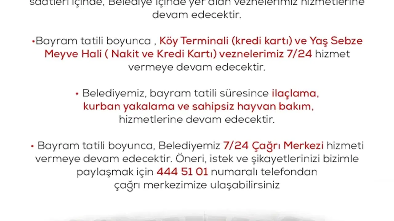 Belediye Başkanı Emrah Özdemir, yaptığı açıklamada, vatandaşların bayram tatili boyunca belediyenin çağrı merkezine telefonla ulaşarak, öneri, istek ve şikayetlerini bildirebileceğini hatırlattı. Başkan Özdemir, kurban kesim yerlerinde de gerekli hijyen ve sağlık koşullarını sağladıklarını belirterek, “Tüm vatandaşlarımızın, Kurban Bayramı’nı kutluyor, bayramı sağlıklı ve huzur içinde geçirmelerini diliyorum” diye konuştu.(DHA)