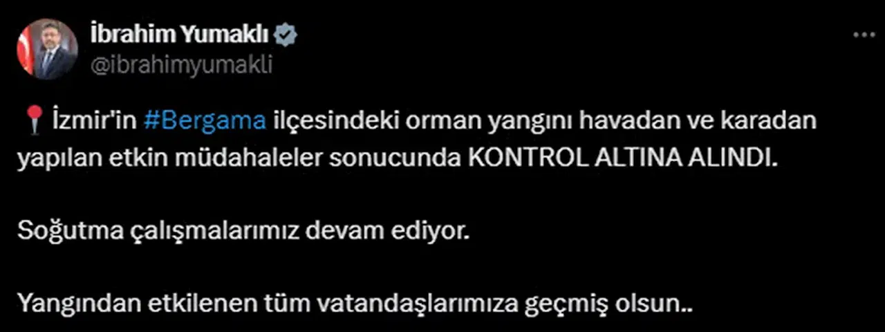 Tarım ve Orman Bakanı İbrahim Yumaklı, sosyal medyadan yaptığı paylaşımda, "İzmir'in Bergama ilçesindeki orman yangını havadan ve karadan yapılan etkin müdahaleyle kontrol altına alınmıştır. Soğutma çalışmalarımız devam ediyor. Yangından etkilenen tüm vatandaşlarımıza geçmiş olsun" ifadelerine yer verdi. (DHA)