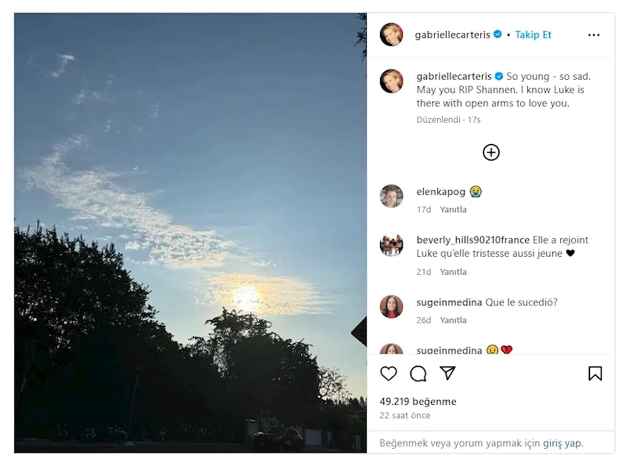 Bir diğer rol arkadaşı Brian Austin Green ise “Shan, kız kardeşim. Sen beni her şeye rağmen sevdin. Aşk anlayışımın büyük bir parçasıydın” mesajını paylaştı. Dizide ‘Andrea’ rolünü oynayan Gabrielle Carteris ise dizide ‘Dylan’ karakteriyle Doherty’nin sevgilisini canlandıran ve 2019’da ölen Luke Perry’e gönderme yaparak “Çok genç, çok üzücü. Huzur içinde yat Shannen. Luke'un seni sevmek için kollarını açarak orada olduğunu biliyorum" dedi.