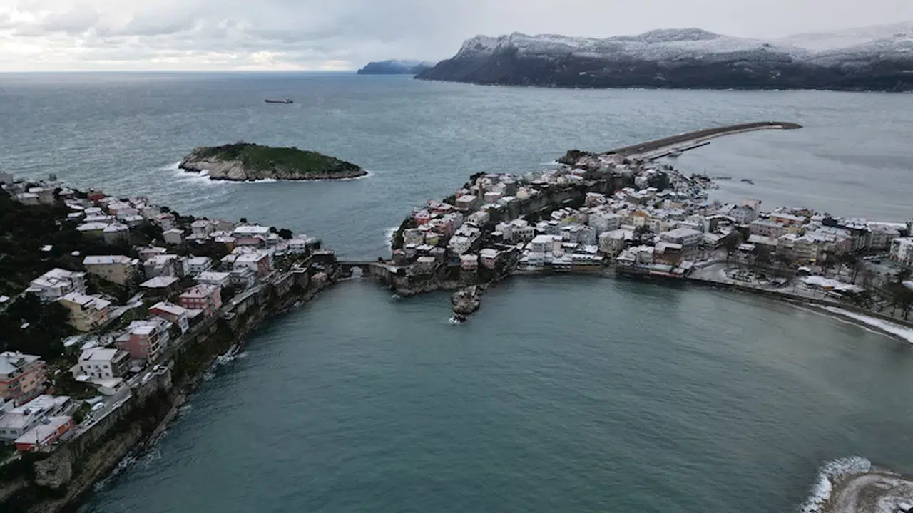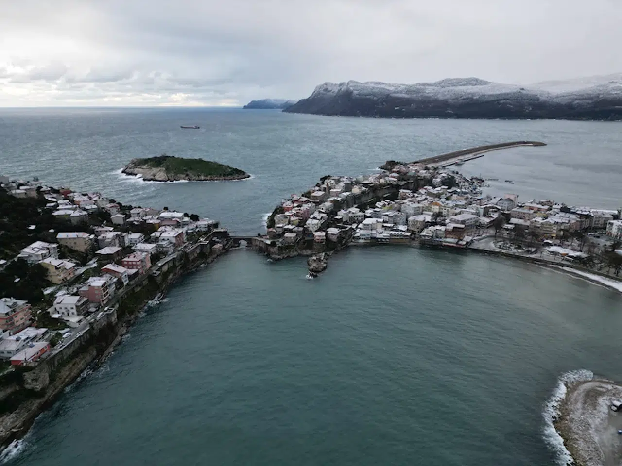 Amasra ilçesinde sabah saatlerinde kar yağışı etkili oldu. İlçe geneli, kar yağışı sonrası beyaz örtüyle kaplandı. Kar kalınlığı 5 santimetreye ulaştı. Soğuk hava nedeniyle sokakların boş kaldığı ilçede, belediye ekipleri kar temizleme çalışması yaparak yolları açık tuttu. Kentteki balıkçılar kötü hava koşulları nedeniyle denize açılamazken, ilçeye gelen az sayıdaki misafir de Amasra Kalesi'ni gezerek hatıra fotoğrafı çekti. UNESCO geçici miras listesinde bulunan Amasra, dronla havadan görüntülendi. (DHA)