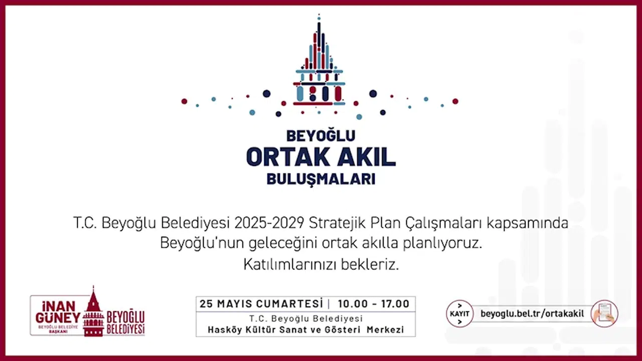 Beyoğlu Belediyesi, 2025-2029 Stratejik Plan Çalışmaları kapsamında Beyoğlu’nun geleceğini ilçe sakinleriyle birlikte şekillendirmek amacıyla Ortak Akıl Buluşmaları düzenleyecek. Beyoğlu Belediye Başkanı İnan Güney katılımıyla gerçekleştirilecek olan buluşmalarda vatandaşlar talep ve önerilerini dile getirecekler.
