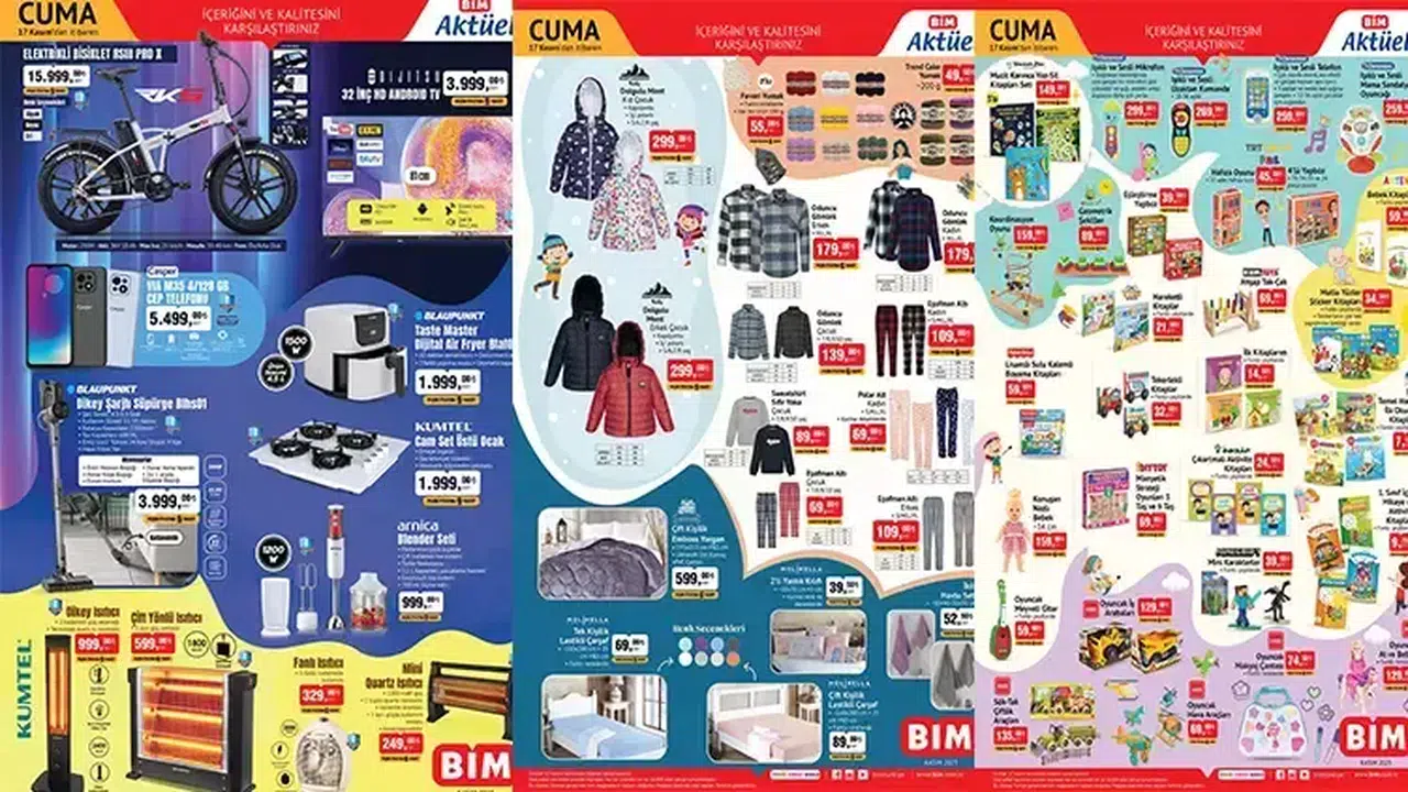 Bim marketlerde Cuma aktüel ürünler sürüyor. Bim 17 Kasım 2023 kampanyasında sizleri bekleyen fırsatları aşağıdaki katalogda inceleyebilirsiniz. Bimde RKS RS3 pro x elektrikli bisiklet 15.999₺ fiyatla satılacak. Dijitsu 4000 liraya 32″ ucuz tv satıyor. Blaupunkt airfryer yine 1999₺ fiyatla satılacak. Blaupunkt dikey şarjlı süpürge 3999₺ fiyatıyla sizi bekliyor.