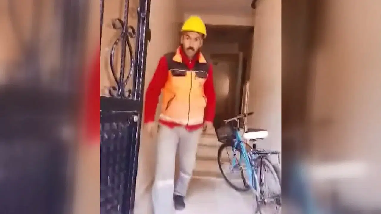 İnegöl ilçesi Turgutalp Mahallesi, Kula Sokak’ta altyapı çalışması yapan enerji şirketinin bağlı taşeron firma işçilerinden Erhan Özkul, apartmandaki bir sorunu çözmek için binaya çamurlu ayakkabılarını çıkarıp girdi. Mahalleli, Özkul dışarı çıkarken o anları cep telefonu ile kayda alıp, görüntüleri sosyal medyada paylaştı. Görüntüler, yoğun ilgi gördü. (DHA)