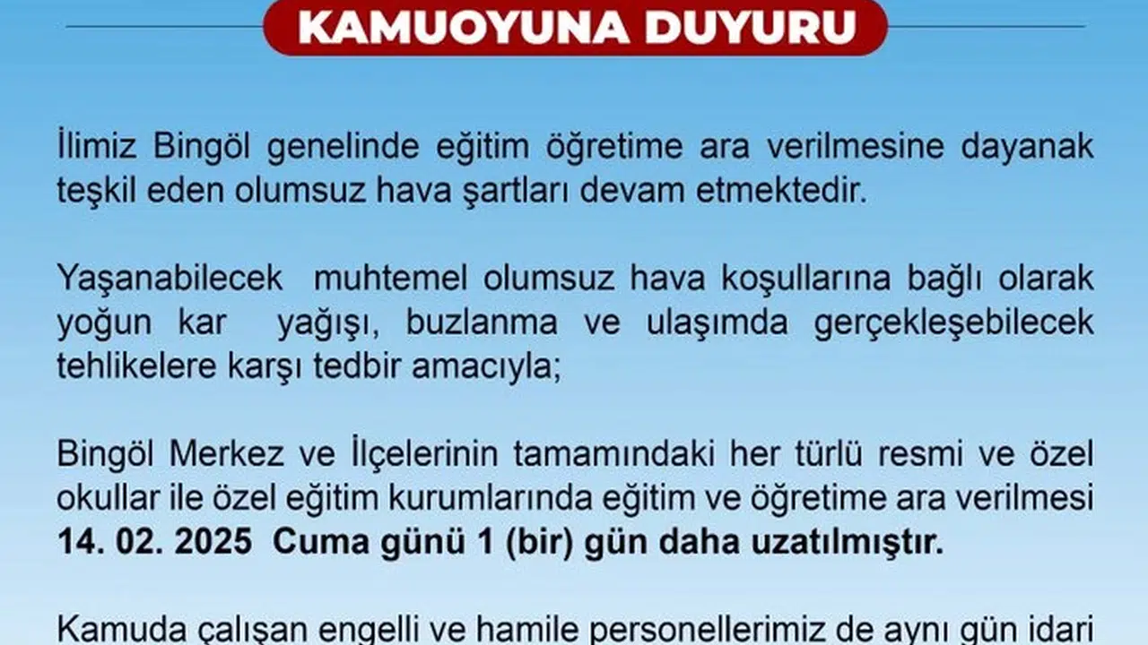 Bingöl Valiliği, kentte etkili olan kar yağışı nedeniyle eğitime 14 Şubat Perşembe günü 1 gün süreyle ara verildiğini duyurdu. Açıklamada, kamuda çalışan engelli ve hamile çalışanların da idari izinli sayılacakları belirtilerek, “İlimiz Bingöl genelinde eğitim öğretime ara verilmesine dayanak teşkil eden olumsuz hava şartları devam etmektedir. Yaşanabilecek muhtemel olumsuz hava koşullarına bağlı olarak yoğun kar yağışı, buzlanma ve ulaşımda gerçekleşebilecek tehlikelere karşı tedbir amacıyla, Bingöl merkez ve ilçelerinin tamamındaki her türlü resmi ve özel okullar ile özel eğitim kurumlarında eğitim ve öğretime ara verilmesi 14 Şubat 2025 Cuma günü 1 gün daha uzatılmıştır. Kamuda çalışan engelli ve hamile personellerimiz de aynı gün idari izinli sayılacaklardır” denildi. (DHA)