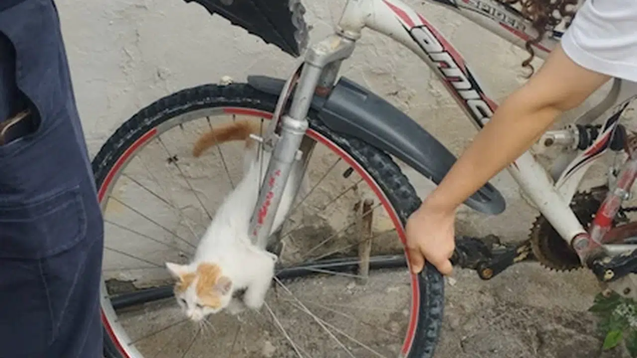 Bisiklet tekerine sıkışan yavru kedi kurtarıldı