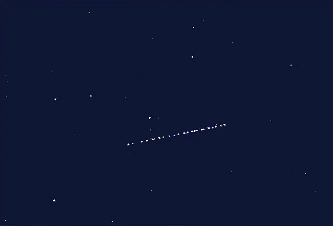 Özcan ÇİRİŞ/BİTLİS,(DHA)-BİTLİS'in Tatvan ilçesi semalarında, dün akşam tek sıra halinde Starlink uydularının geçişi görüldü. O anlar, çevredekilerin cep telefonu kamerasıyla kaydedildi.