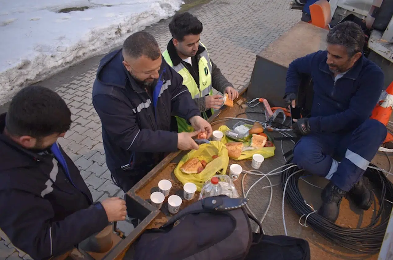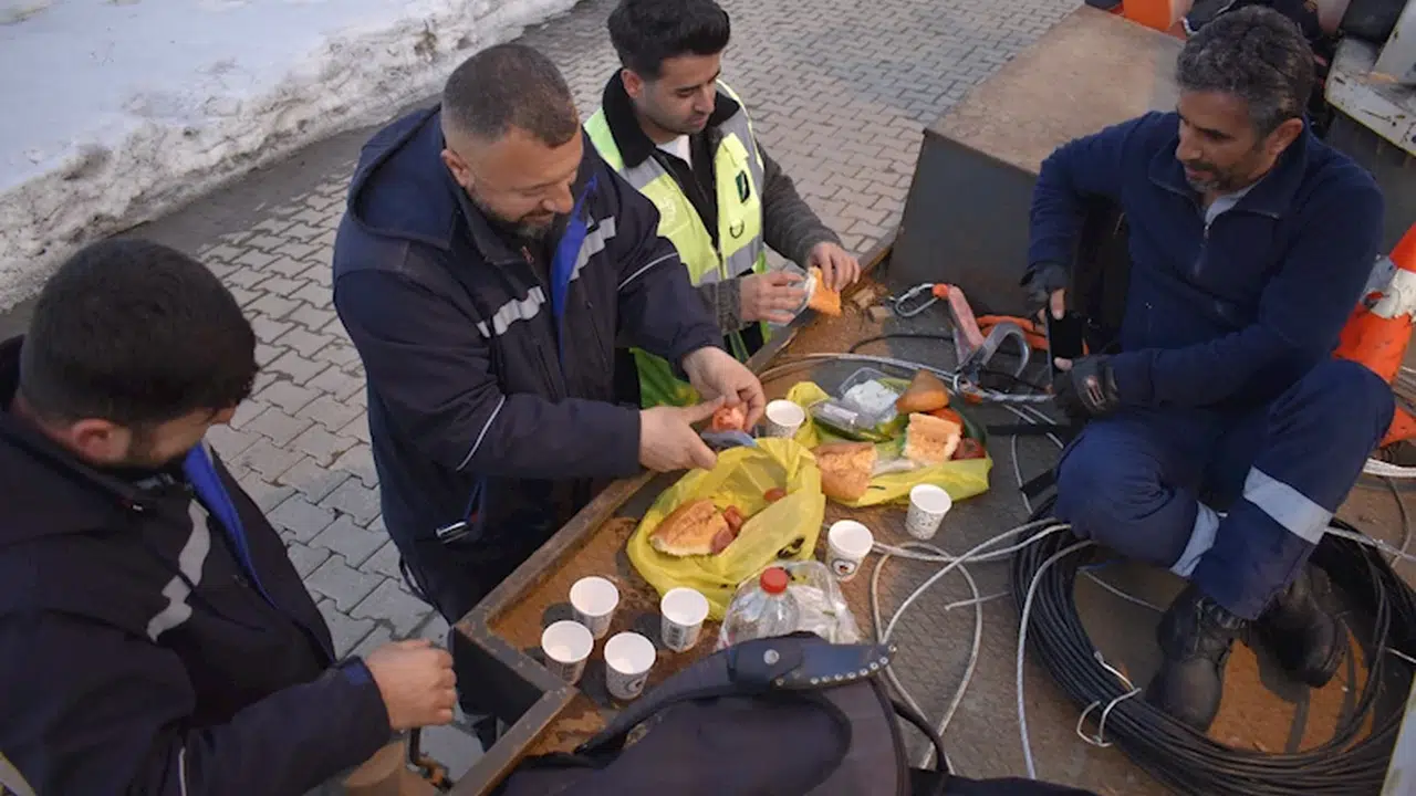 Van Gölü Elektrik Dağıtım A.Ş. (VEDAŞ) arıza ekipleri, vatandaşa kesintisiz enerji sağlamak için 7 gün 24 saat çalışıyor. Mesai saati gözetmeyen ekipler, bazen iftarlarını da arızaya gittikleri boş arazilerde yapıyorlar. Bitlis'in Küllüce köyünde de arıza ihbarı alan ekipler, araçla gittikleri bölgede kopan ileti hatlarını onarıp arızayı giderdi. Arızanın giderilmesi uzun sürünce de ekip, yanlarında getirdikleri su, ekmek, peynir, domates ve soğan ile çalıştıkları elektrik direğinin dibinde sofra kurup iftar yaptı. VEDAŞ Koordinatör Mühendisi Muhammet Danışman, “Arıza bakım onarım personellerimizle beraber 7 gün 24 saat kar kış demeden enerji akışının sağlanması ve vatandaşların mağdur olmaması için sahadayız." dedi.