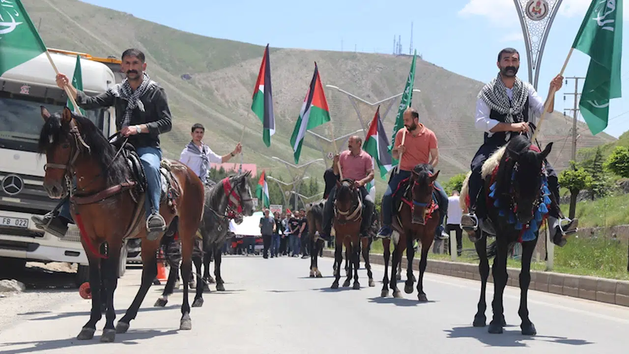 Filistin Dayanışma Platformu tarafından İsrail'in saldırılarını protesto etmek için düzenlenen yürüyüş Hüsrevpaşa Mahallesi’ndeki Hacı Mehmet Şirin Camisi önünde başladı. Yüzlerce kişi, ellerinde pankartlar ve Filistin bayraklarıyla yaklaşık 3 kilometre uzaklıktaki Bitlis-Mevlana Parkı’na kadar yürüdü. Kalabalığa atlı bir grup da eşlik etti. Burada Kur’an-ı Kerim okuyan grup daha sonra basın açıklaması yaptı.