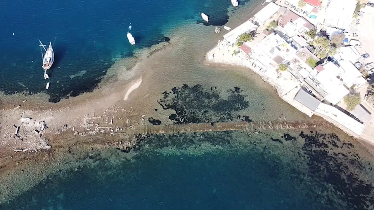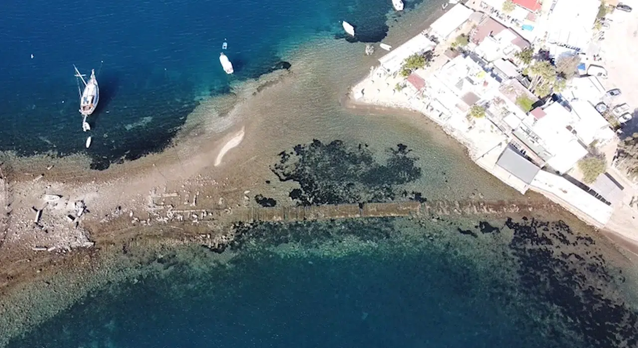 Fırat AKAY/BODRUM (Muğla), (DHA)- MUĞLA'nın Bodrum ilçesinde deniz suyunun çekilmesiyle 3 bin 500 yıllık Myndos kentine giden 'Kral Yolu', gün yüzüne çıktı. Yılın bu zamanlarında ortaya çıkan yol, dronla havadan görüntülendi.