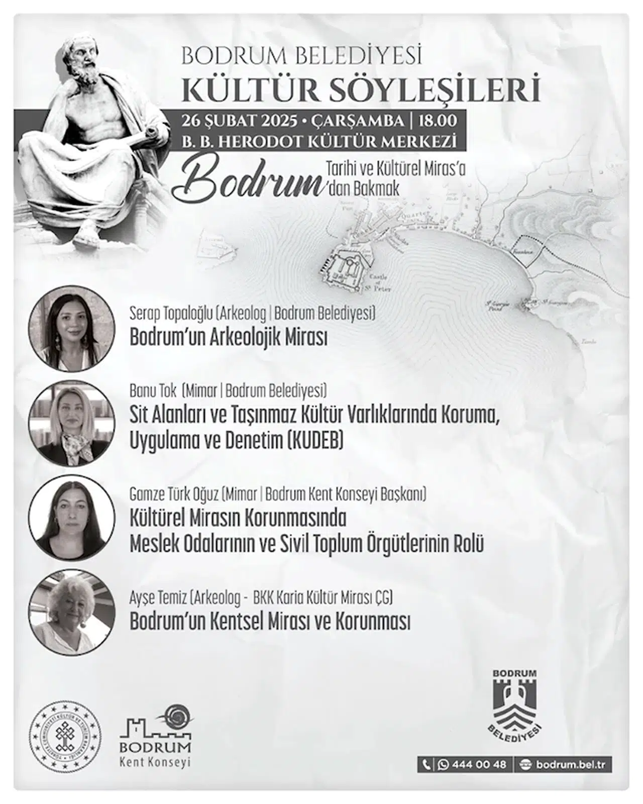 Bodrum Belediyesi Kültür ve Sosyal İşler Müdürlüğü Pedasa ve Leleg Uygarlığı Araştırma ve Uygulama Birimi tarafından 'Bodrum'un Tarihi ve Kültürel Mirasa Bodrum'dan Bakmak' başlığıyla kültür söyleşileri düzenlenecek. Yarın saat 18.00'de Herodot Kültür Merkezi'nde yapılacak olan kültür söyleşilerinde Arkeolog Serap Topaloğlu, 'Bodrum'un Arkeolojik Mirası', Mimar Banu Tok 'SİT Alanları ve Taşınmaz Kültür Varlıklarında Koruma, Uygulama ve Denetim', Mimar Gamze Türk Oğuz 'Kültürel Mirasın Korunmasında Meslek Odalarının ve Sivil Toplum Örgütlerinin Rolü', Arkeolog Ayşe Temiz ise 'Bodrum'un Kentsel Mirası ve Korunması' alt başlıklarıyla bilgiler paylaşacak.
