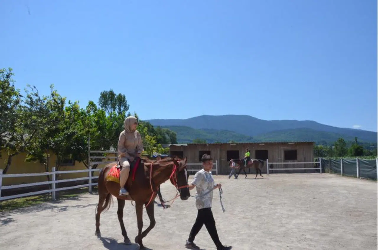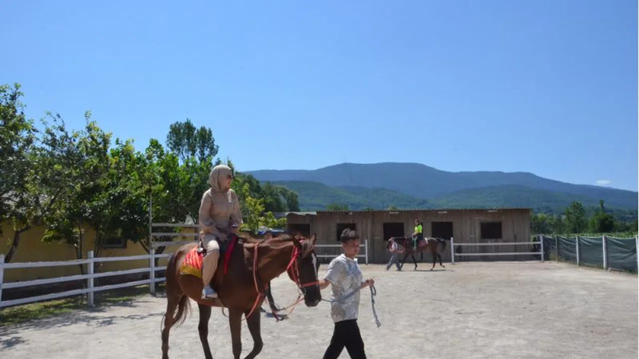 Merkeze bağlı Köprücüler köyünde bulunan at çiftliğine götürülen yetim ve öksüz çocuklar kahvaltı yaptıktan sonra ata bindi.