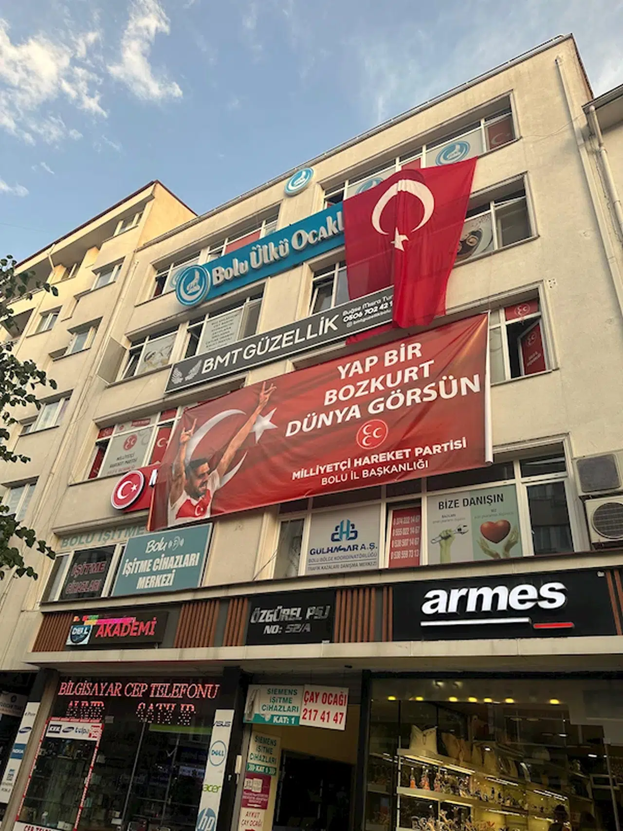 Mutlu YUCA/ BOLU, (DHA)- BOLU'da MHP İl Başkanlığı, Türkiye'nin Avusturya ile oynadığı milli maçta attığı golün ardından bozkurt işareti yapan ve hakkında UEFA tarafından soruşturma başlatılan Melih Demiral'ın bozkurtlu fotoğrafı ile 'Yap bir bozkurt dünya görsün' yazılı pankartını binaya asarak milli futbolcuya destek verdi.