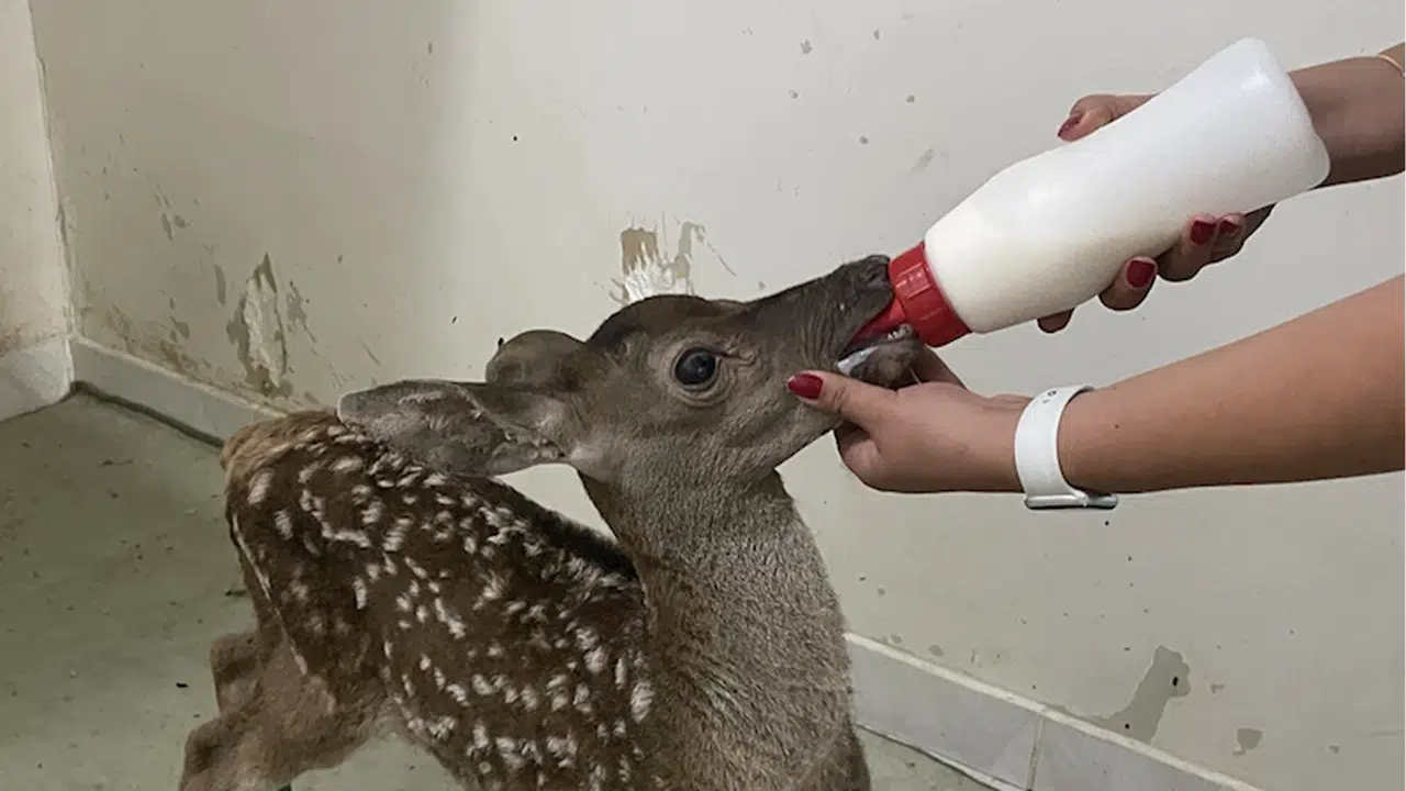 "Bala" ismi verilen geyik yavrusuna, tedaviye alındığı veteriner kliniğinde özenle bakılıyor, biberonla keçi sütü veriliyor.