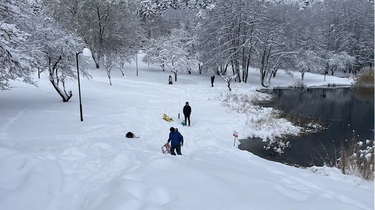 Karla kaplanan yürüyüş yollarında gezerken manzarayı da fotoğraflayan ziyaretçiler, kızaklarla kaydı, çocuklarıyla kar topu oynadı.