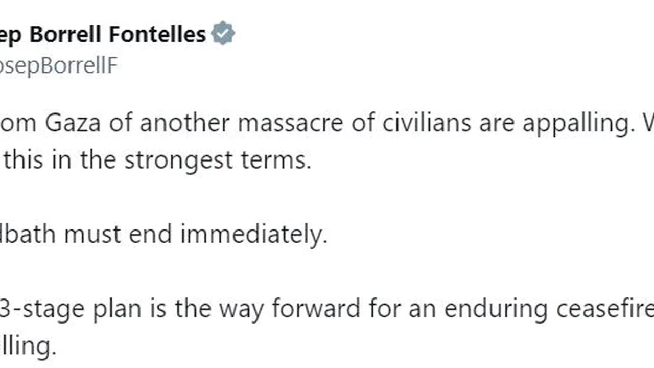 Avrupa Komisyonu Dış İlişkiler Yüksek Temsilcisi ve Avrupa Komisyonu Başkan Yardımcısı Borrell, yaptığı açıklamada, “Gazze'de sivillere yönelik yeni bir katliam haberi dehşet vericidir. Bunu en güçlü şekilde kınıyoruz. Bu katliam derhal sona ermelidir. Amerika Birleşik Devletleri Başkanı'nın 3 aşamalı planı, kalıcı bir ateşkes ve ölümlerin sona erdirilmesi için ileriye dönük bir yoldur” ifadelerini kullandı.