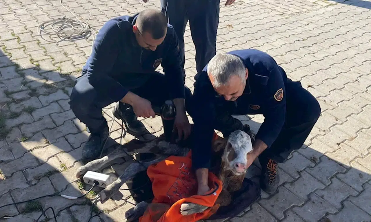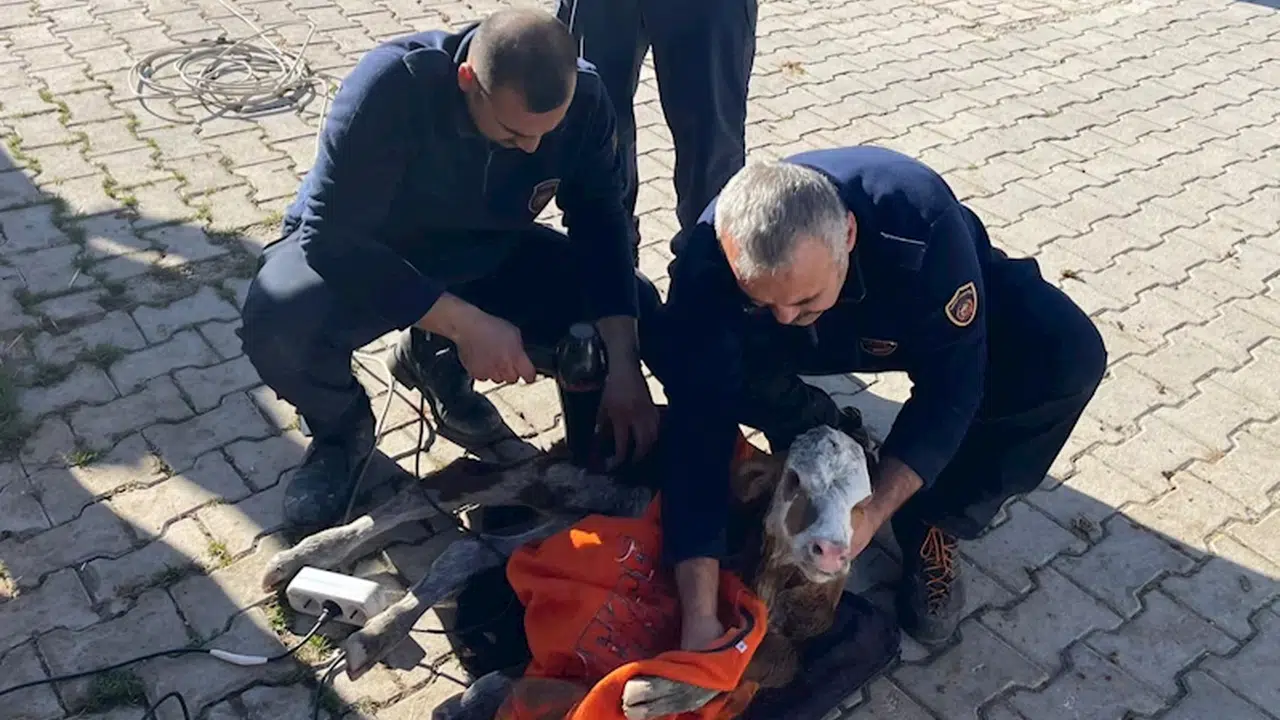 Boruya sıkışan buzağıyı itfaiye kurtardı
