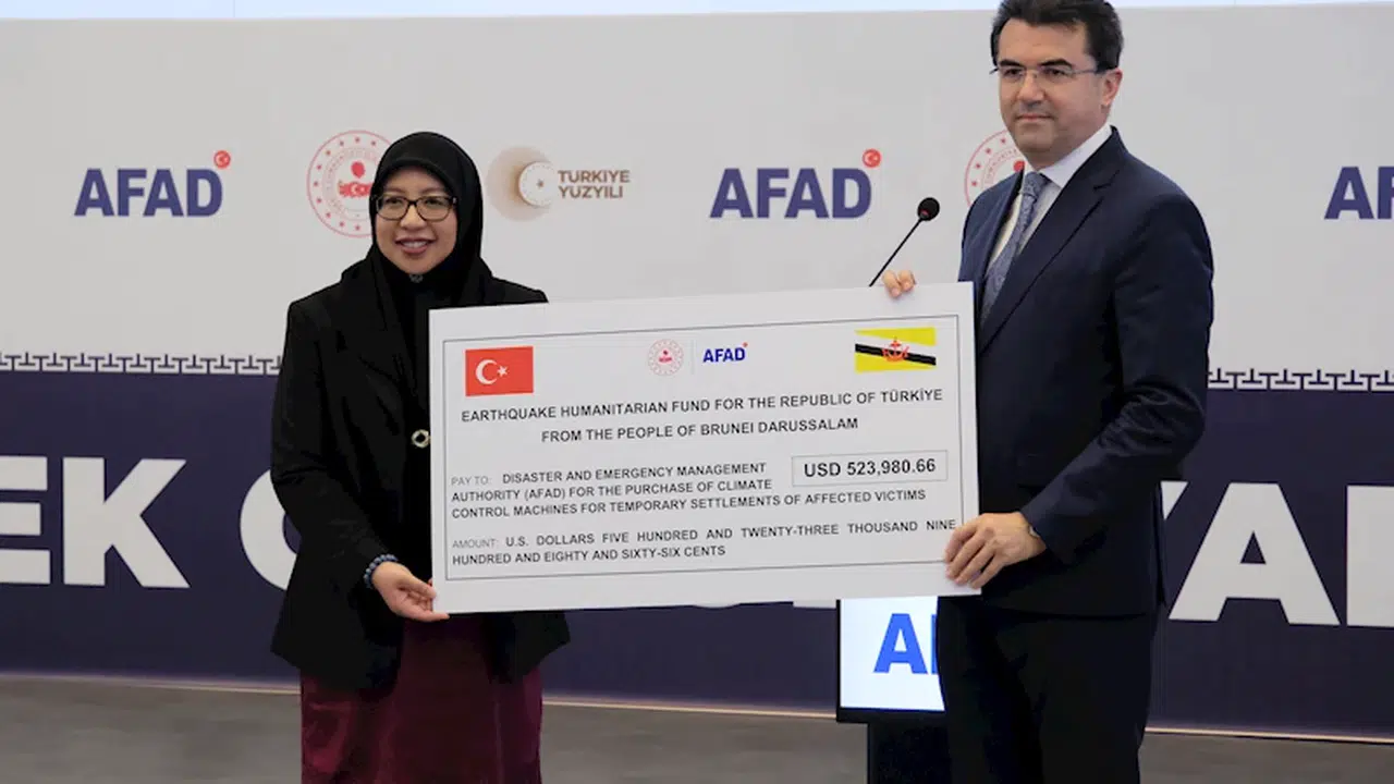 Samet ÖKSÜZ-Mikail KARAMAN/ANKARA, (DHA)- BRUNEİ Darüsselam Büyükelçisi Noni Zurainah Ismi, ülkesinin vatandaşlarının Türkiye'deki depremzedeler için topladığı 523 bin 980 dolarlık yardım fonunu, Afet ve Acil Durum Yönetimi (AFAD) Başkanı Okay Memiş'e takdim etti.
