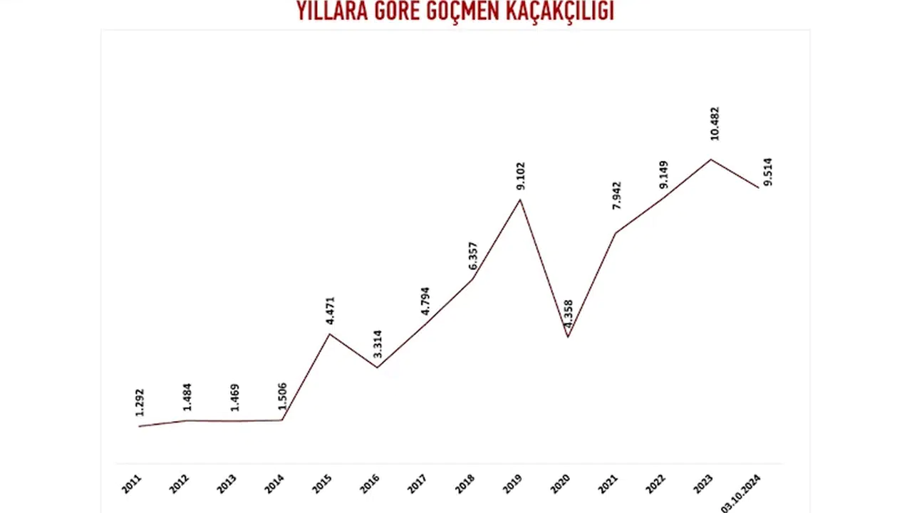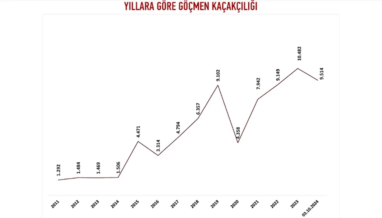 İçişleri Bakanlığı Göç İdaresi Başkanlığı verilerine göre, 3 Ekim itibarıyla 9 bin 514 göçmen kaçakçısı yakalandı. Son 14 yılda göçmen kaçakçısı en fazla 10 bin 482 ile 2023'te yakalandı. Türkiye'de 2011 yılından bu yana ise 75 bin 234 göçmen kaçakçısı yakalandı. Yıllara göre göçmen kaçakçılığı sayısı şöyle: