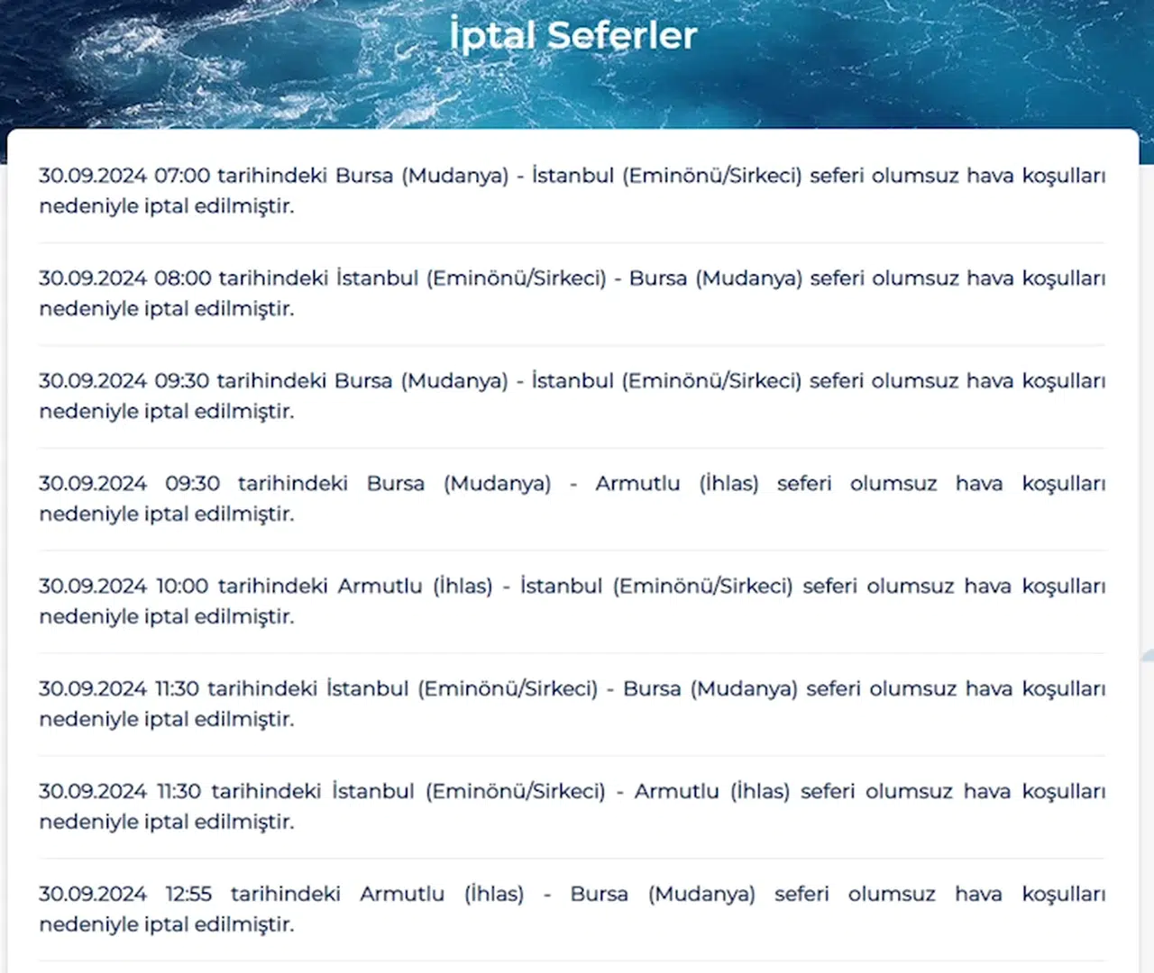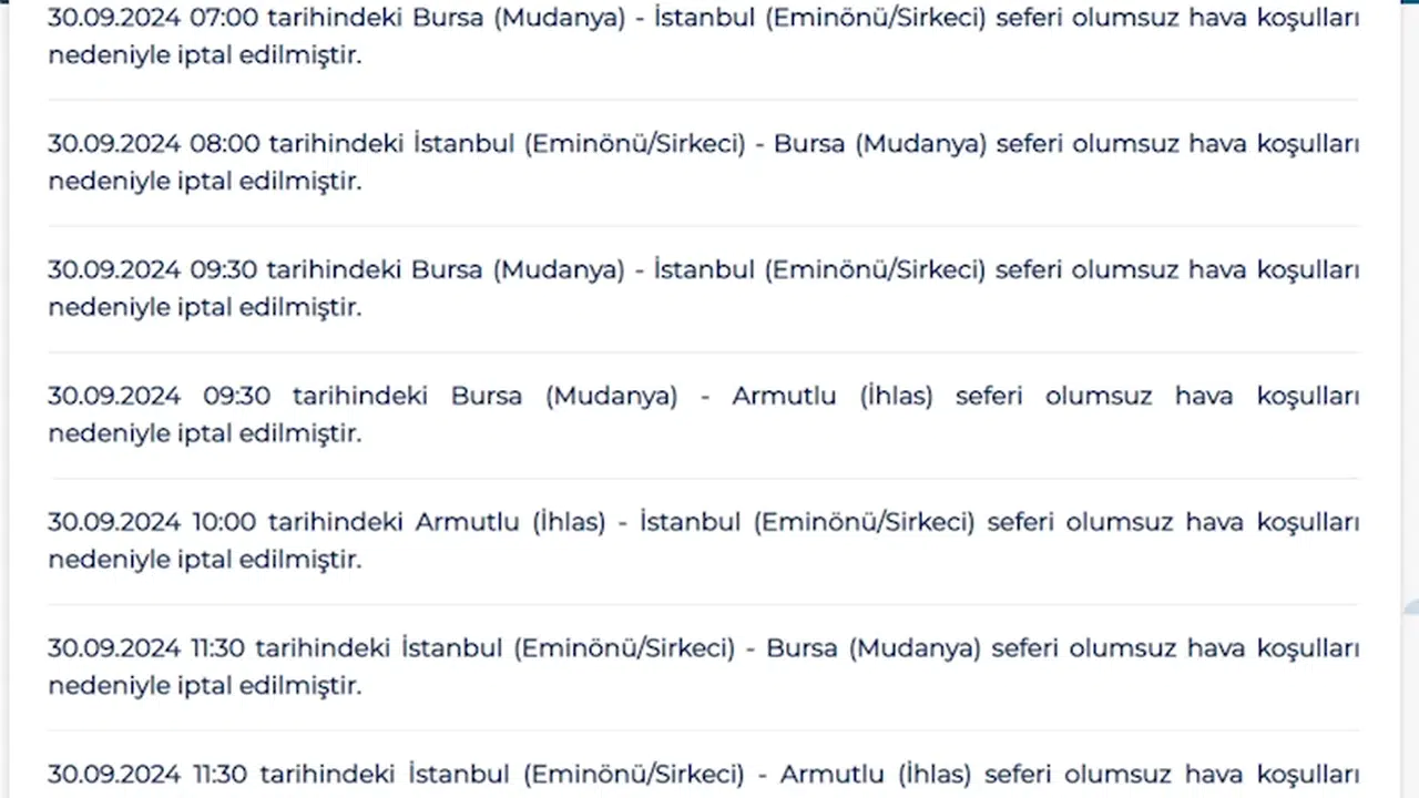 Bursa Deniz Otobüsleri, olumsuz hava koşulları nedeniyle bugün yapılacak olan 8 seferini iptal etti. BUDO'dan yapılan duyuruda, 07.00 ile 12.55 saatleri arasında yapılması planlanan Bursa (Mudanya) - İstanbul (Eminönü/Sirkeci), İstanbul (Eminönü/Sirkeci) - Bursa (Mudanya), Bursa (Mudanya) - İstanbul (Eminönü/Sirkeci), Bursa (Mudanya) - Armutlu (İhlas), Armutlu (İhlas) - İstanbul (Eminönü/Sirkeci), İstanbul (Eminönü/Sirkeci) - Bursa (Mudanya), İstanbul (Eminönü/Sirkeci) - Armutlu (İhlas), Armutlu (İhlas) - Bursa (Mudanya) olmak üzere karşılıklı 8 deniz otobüsü seferinin iptal edildiğini belirtildi. (DHA)