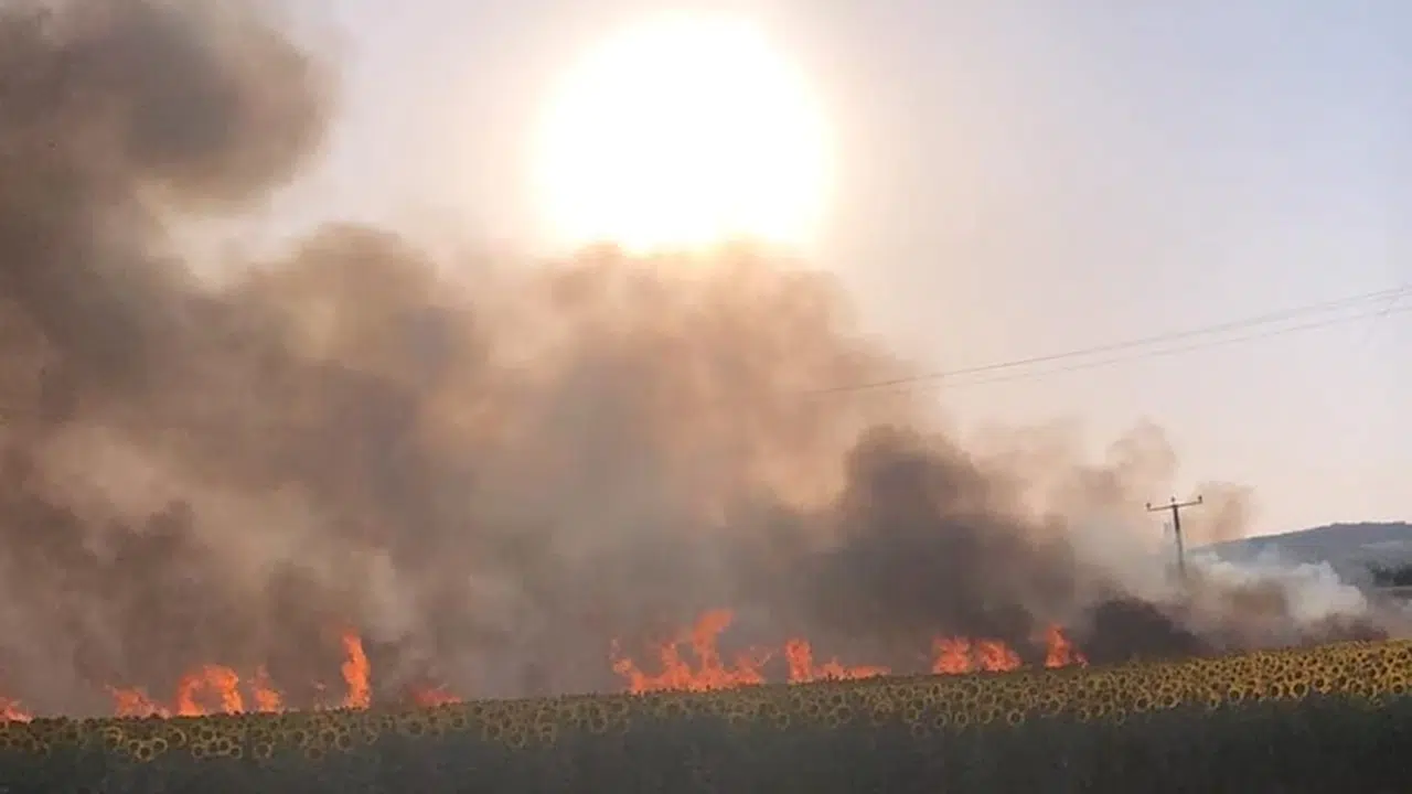 Yavuz YILMAZ/İNEGÖL (Bursa), (DHA)- BURSA'nın İnegöl ilçesinde, kopan enerji nakil hattından tarlaya sıçrayan kıvılcımlar, ekinleri tutuşturdu. Rüzgarın etkisiyle kısa sürede büyüyen yangın 1 saatte kontrol altına alınırken, 60 dönüm alanda ekili olan buğdaylar yandı.