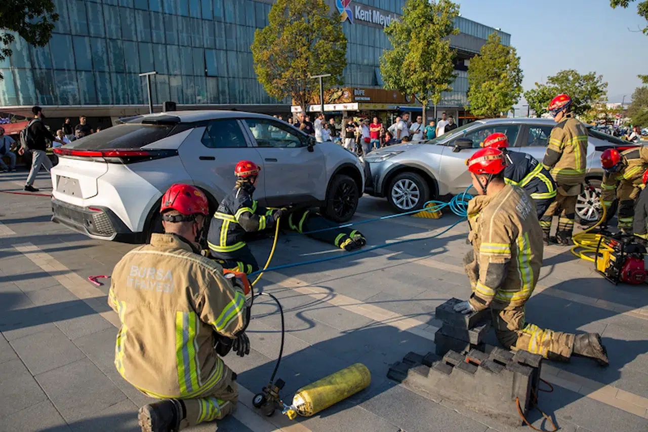 İtfaiye Teşkilatı’nın 310'uncu kuruluş yıldönümü ve İtfaiye Haftası kapsamında Büyükşehir Belediyesi İtfaiye ekipleri tarafından Kent Meydanı’nda yaralı kurtarma tatbikatı gerçekleştirildi. UMKE ekiplerinin de yer aldığı tatbikatta, senaryo gereği seyir halindeki iki elektrikli otomobil çarpıştı. Alınan ihbar üzerine kısa sürede itfaiye ve UMKE ekipleri olay yerine intikal etti. Kaza sonras altında kaldıkları aracın içinde sıkışan yaralılar, sağlık ekipleri tarafından durumları kontrol edildikten sonra itfaiye ekipleri tarafındansıkıştıkları yerden kurtarıldı. Otomobillerin elektrikli olması sebebiyle büyük bir titizlikle müdahale eden itfaiye ekipleri, yaralıları kurtardıktan sonra sağlık ekiplerine teslim etti. Aksiyon filmlerini aratmayan görüntülerin ortaya çıktığı tatbikat, çevredeki vatandaşlar tarafından büyük ilgiyle takip edildi. Yaralıların araçlardan başarıyla kurtarılmasını izleyen vatandaşlar, itfaiye ve UMKE ekiplerini alkışlarla tebrik etti.