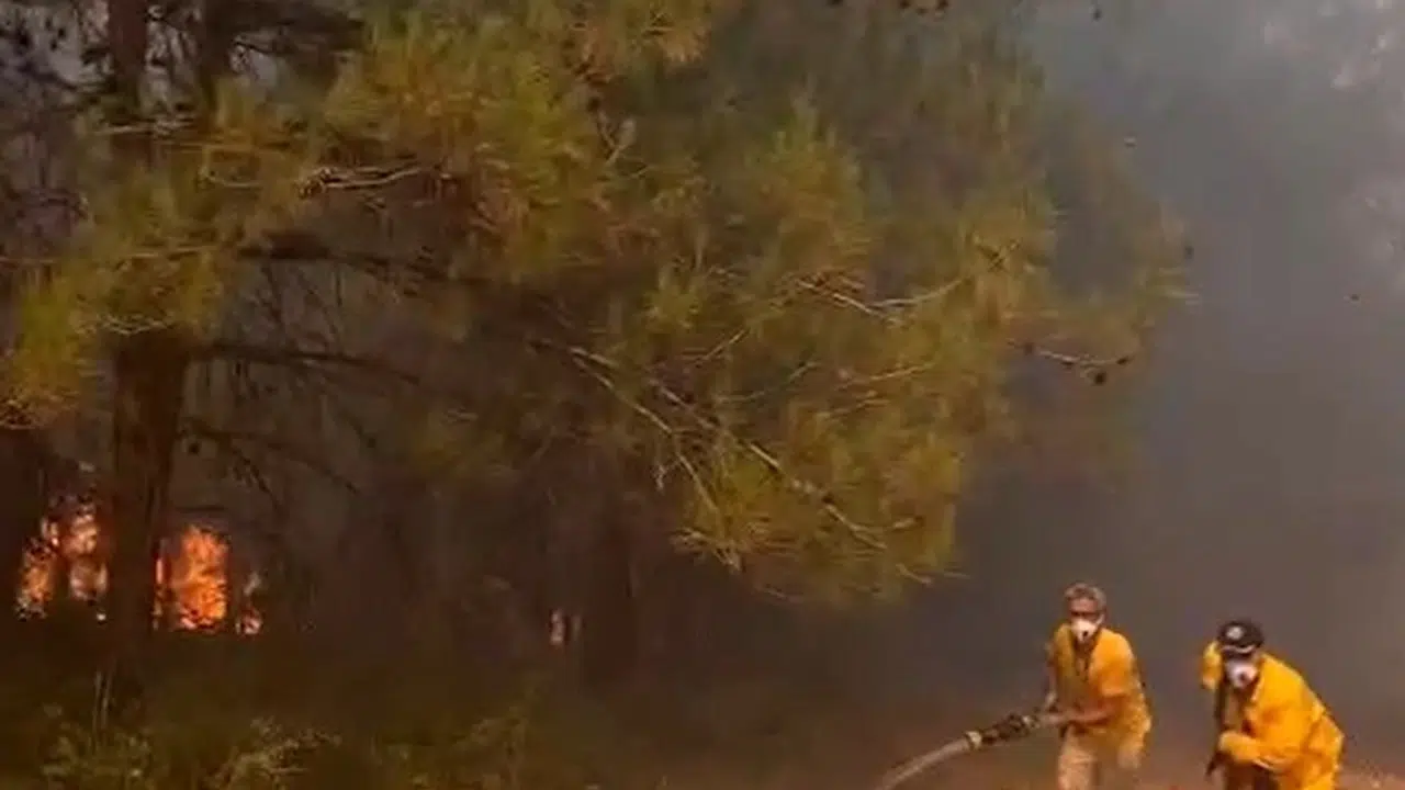 Bursa'da Bursa Uludağ Üniversitesi (BUÜ) kampüsünün de içinde olduğu ormana sıçrayan anız yangınına karadan 150 personel, havadan da 4 helikopterle müdahale sürerken, bölgeye iş makineleri ile TOMA'lar da sevk edildi. Çam ve meşe ağaçlarının olduğu ormanda çıkan yangın rüzgarın da etkisiyle kontrol altına alınamazken, alevlere müdahale eden Orman İşletme Müdürlüğü ekipleri ile yangını görüntüleyen gazeteciler, hızla ilerleyen alevlerin arasında kalmaktan son anda kurtuldu. Yaşanan panik anları, cep telefonu kamerasına yansıdı. (DHA)