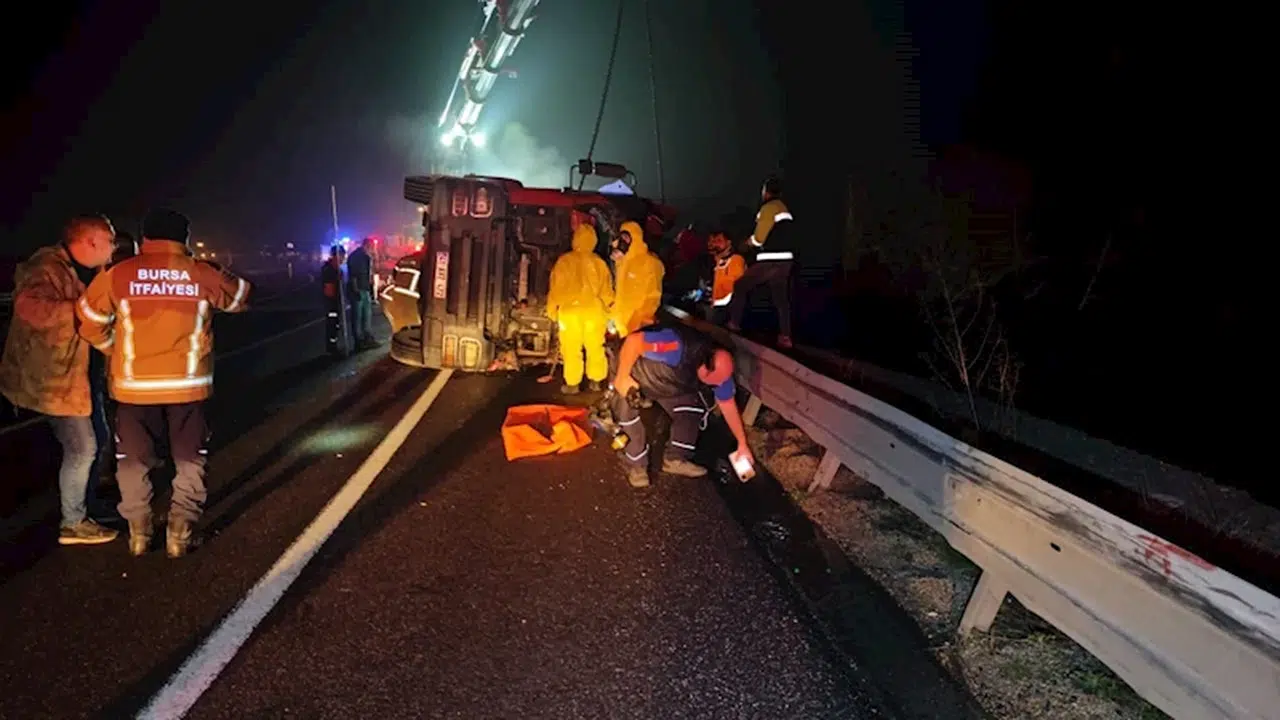 Bursa’nın İnegöl ilçesinde karşı şeride geçen asit yüklü tankerin devrilmesi sonucu araçta sıkışarak hayatını kaybeden şoför Kıyasettin Kara’nın cansız bedeni, AFAD ekiplerince bulunduğu yerden çıkarılarak İnegöl Devlet Hastanesi’nin morguna kaldırıldı. (DHA)