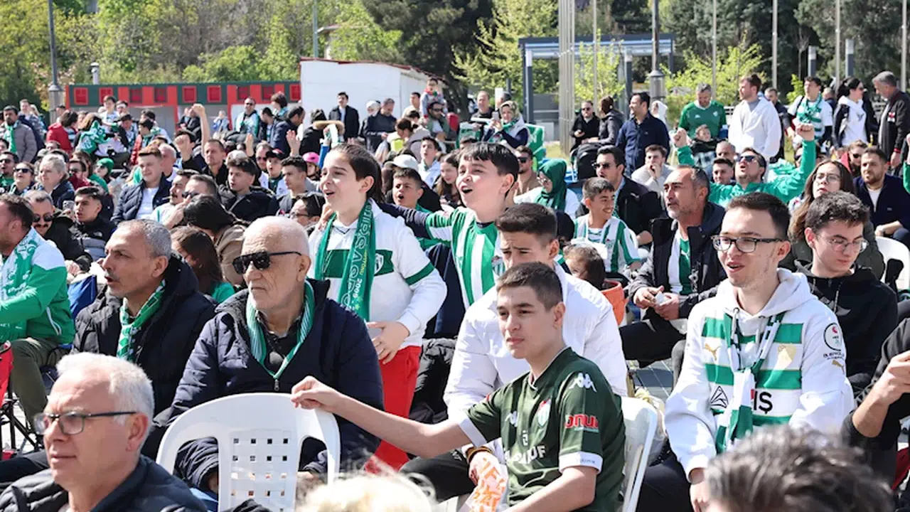 Bursaspor’un TFF 3’üncü Lig 1’inci Grup’ta Artvin Hopaspor’u 2-1 mağlup ettiği karşılaşma, Nilüfer Belediyesi’nin organizasyonuyla Nilüfer Belediyesi Halk Evi önündeki Cumhuriyet Meydanı’nda dev ekranda yayınlandı. ‘Formanı Giy, Sandalyeni Kap Gel’ sloganıyla düzenlenen etkinlik, yüzlerce taraftarı bir araya getirdi. Nilüfer Belediyesi Halk Evi önündeki Cumhuriyet Meydanı, yeşil beyazlı renklere gönül veren taraftarlarla dolup taştı. Her yaştan Bursaspor taraftarının akın ettiği meydanda, şampiyonluk heyecanı hep birlikte yaşandı. Nilüfer Belediye Başkanı Şadi Özdemir’in eşi Nuray Özdemir de taraftarlarla birlikte şampiyonluk maçını izledi. Karşılaşmayı büyük bir coşkuyla takip eden taraftarlar, tezahüratlarla takımlarına destek verdi. Şampiyonluk sevincinin doruğa çıktığı anlarda yakılan meşaleler, meydanda renkli görüntüler oluşturdu.