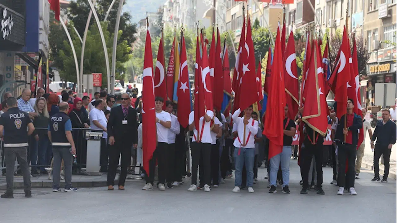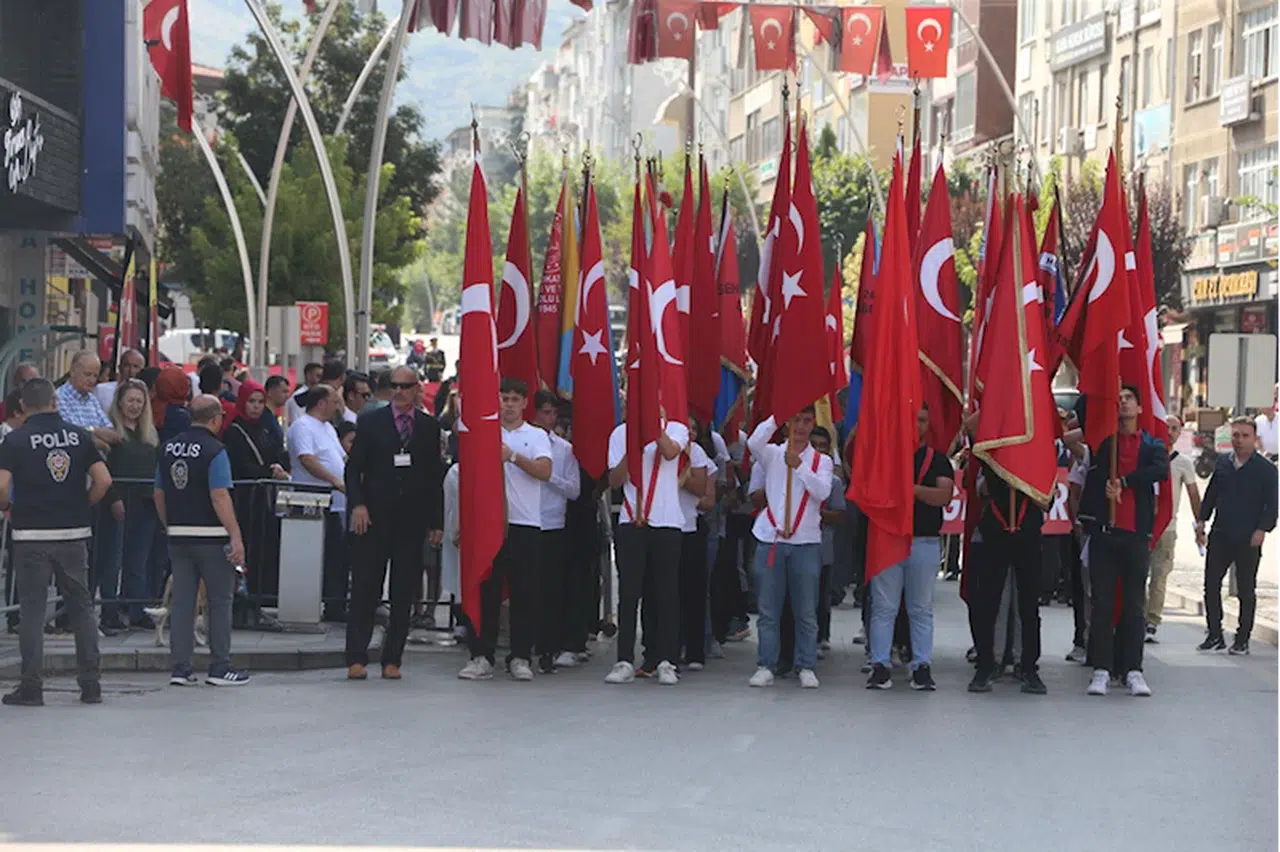 Vali Yılmaz Doruk, Garnizon Komutanı Tuğgeneral Kemal Çakıroğlu ve Belediye Başkanı Turgay Sevindi, vatandaşları ve tören birliklerini selamladı.